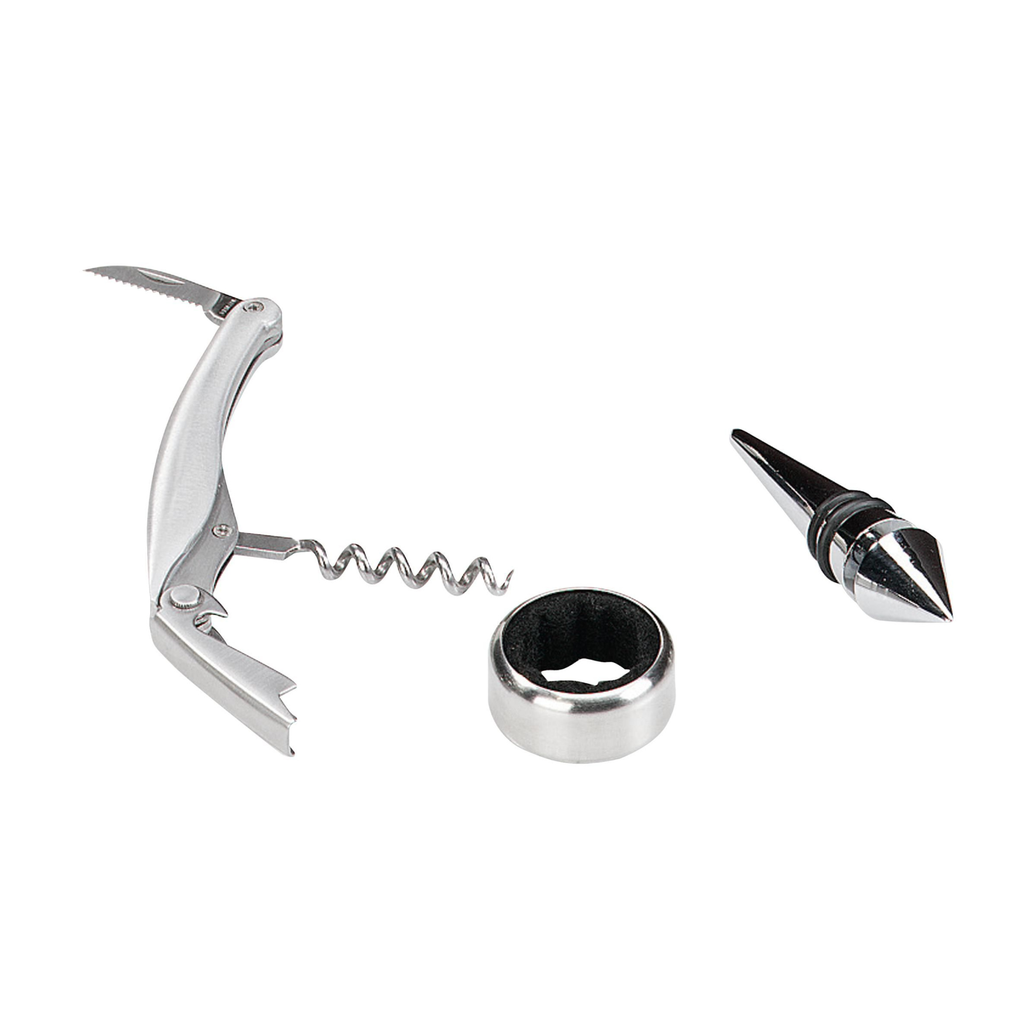 Edle Weinkiste aus Holz mit Tropfenfänger, Flaschenverschluss und Kellnermesser aus Edelstahl. Exkl. Wein. Lieferung als Set im braunen Karton.