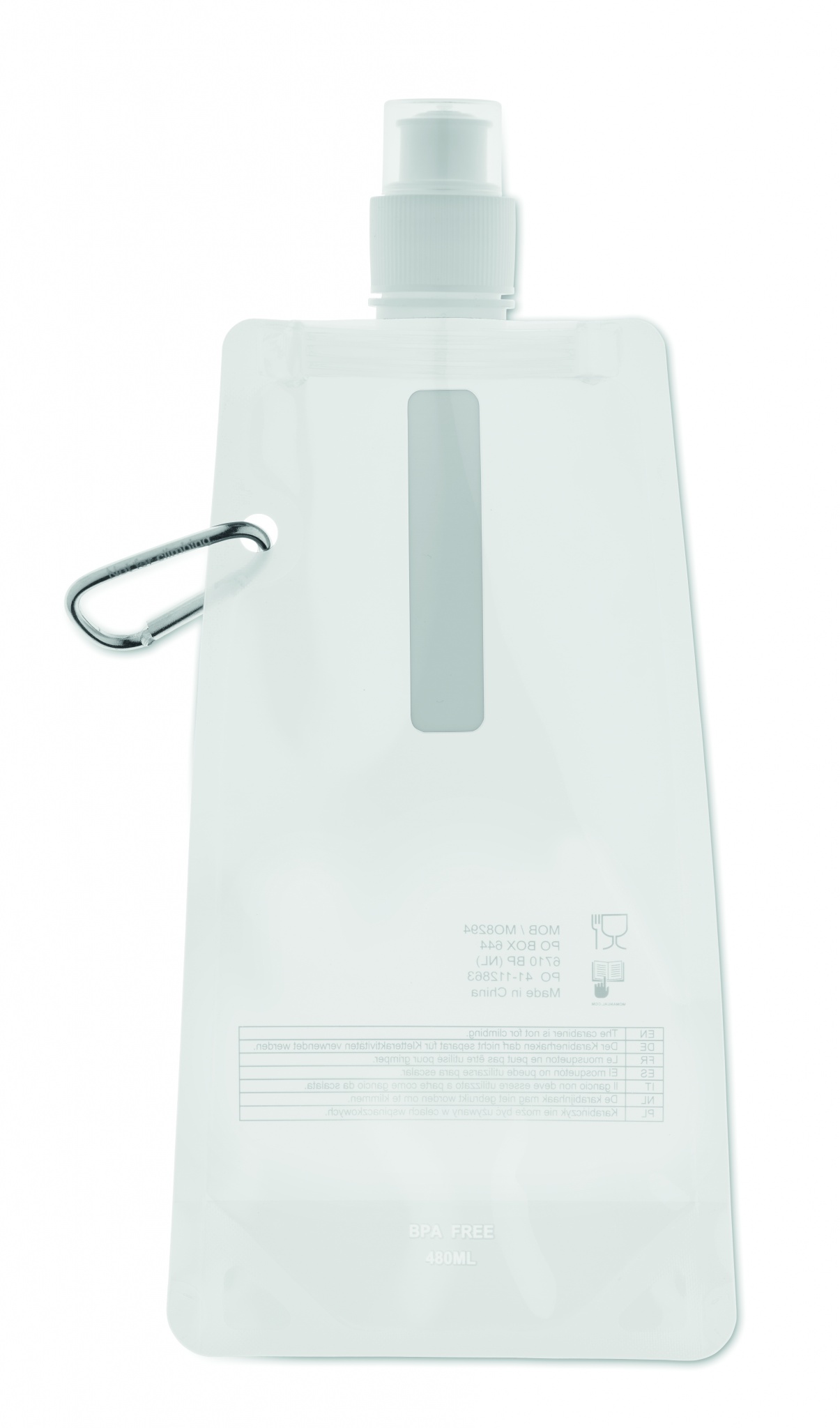 Faltbare Wasserflasche aus BPA freiem PET mit Alu-Karabiner. Füllmenge: 480 ml.