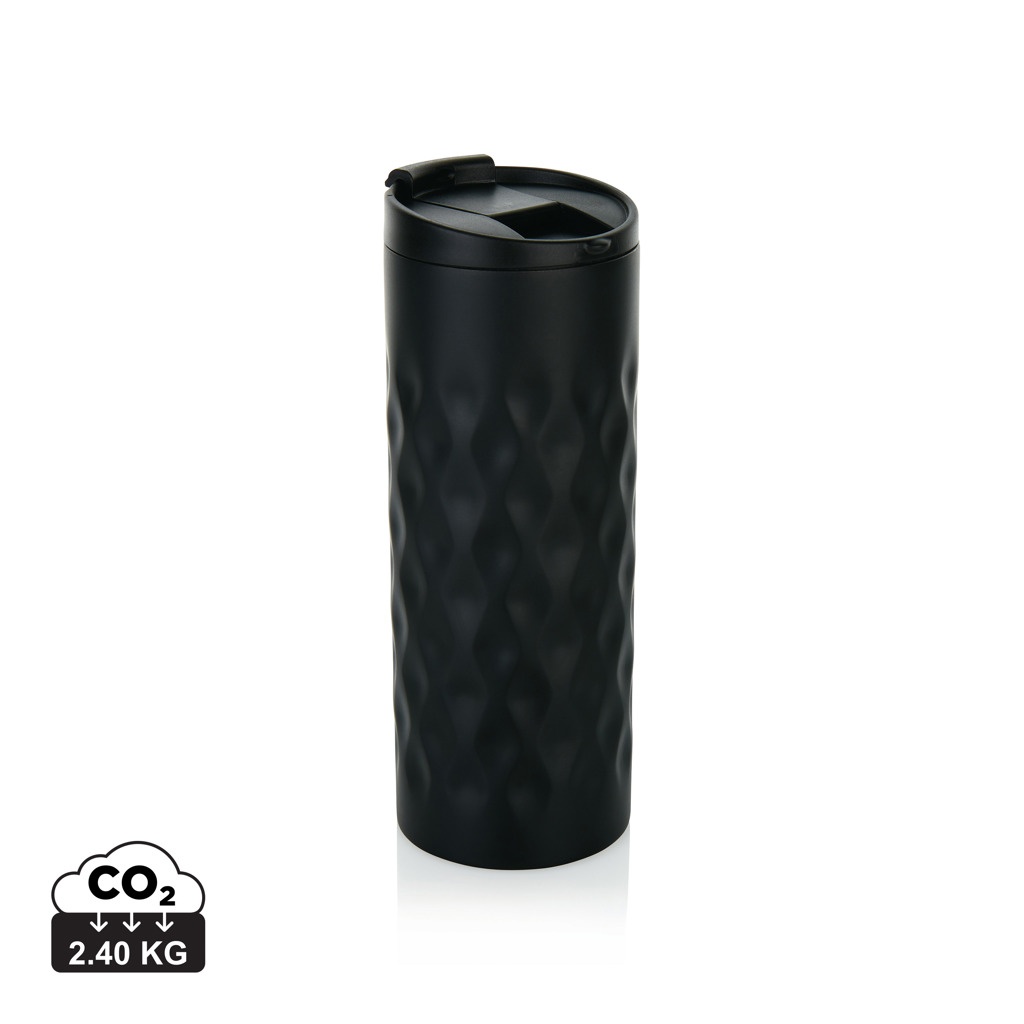 Doppelwandiger Becher aus Edelstahl mit trendigem, geometrischem Cut-Design. Inhalt: 350ml. Nur Handwäsche.