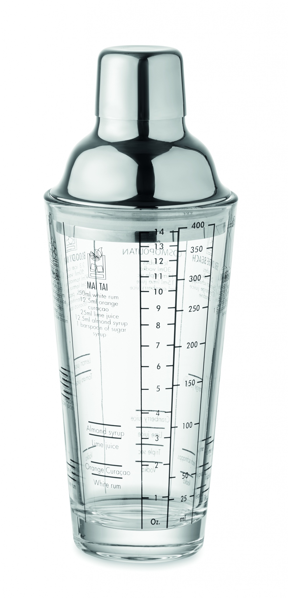 Cocktailshaker aus Glas. Deckel aus Edelstahl. Aufgedruckte Maßeinheiten und Cocktailrezepte auf dem Glas. Füllmenge: 400 ml.