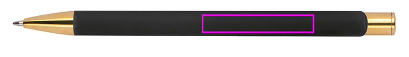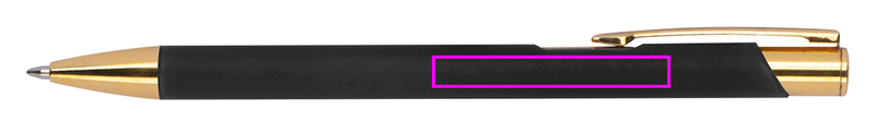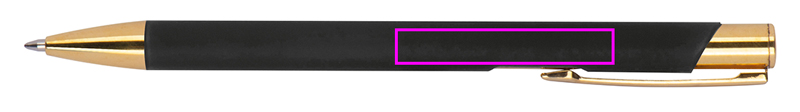 Kugelschreiber aus Aluminium mit goldenen Applikationen, Rubber-Finish und blauschreibender Großraummine. Ihre Werbung wird auf der rechten Seite des Clips eingelasert und erscheint in der Farbe Gold.