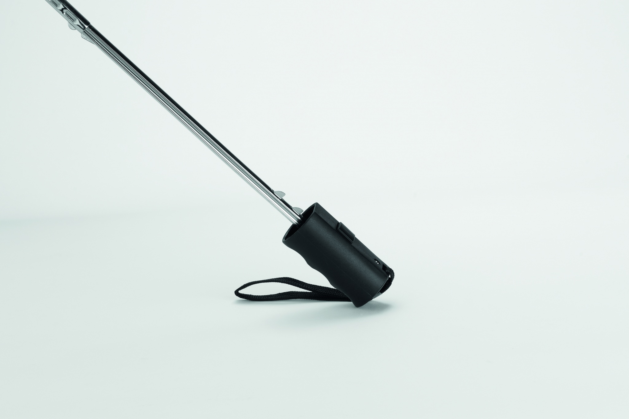 21'' Regenschirm aus 190T Seide. 2-fach faltbar. Gestell aus verzinktem Stahl, Schienen und Spitzen. Segmente mit reflektierendem Rand. Schwarzer Griff aus Kunststoff mit Handschlaufe. Passende Schirmhülle. Automatische Öffnung, manuelle Schließung.