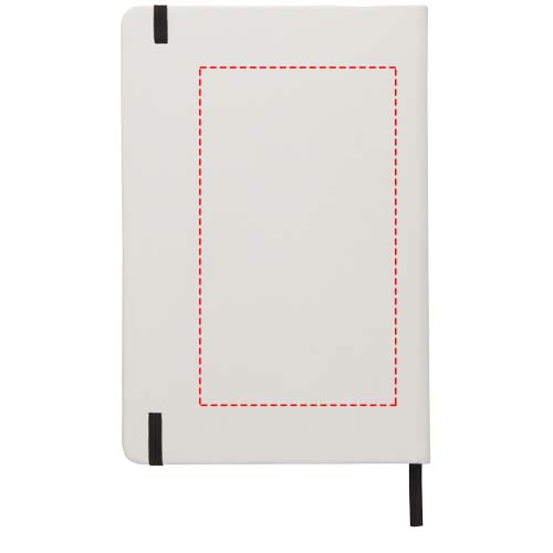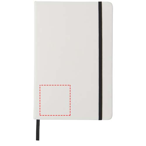 Weißes A5 Notizbuch mit farbigem Gummizug und Lesebändchen. Enthält 80 Blatt (60 g/m²) liniertes Papier.