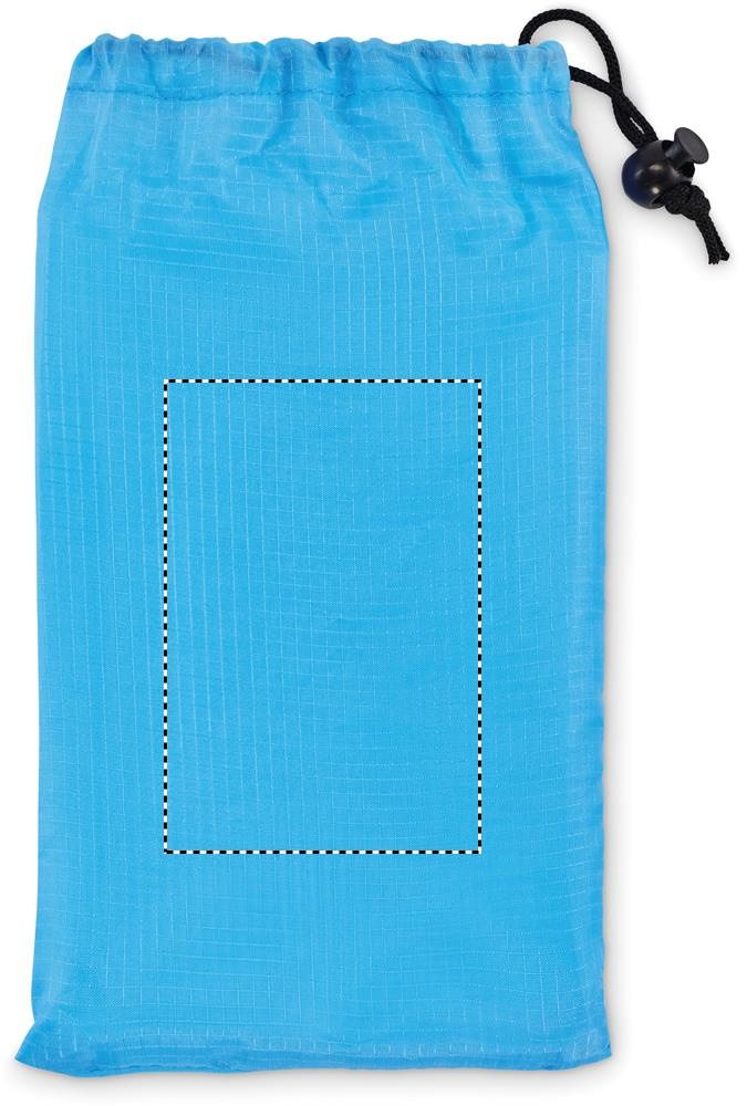 Leichte Strandmatte aus 210T Polyester. Inkl. 4 schwarzen Haken und passendem Beutel mit Kordelzug. Maße: 200x210cm.