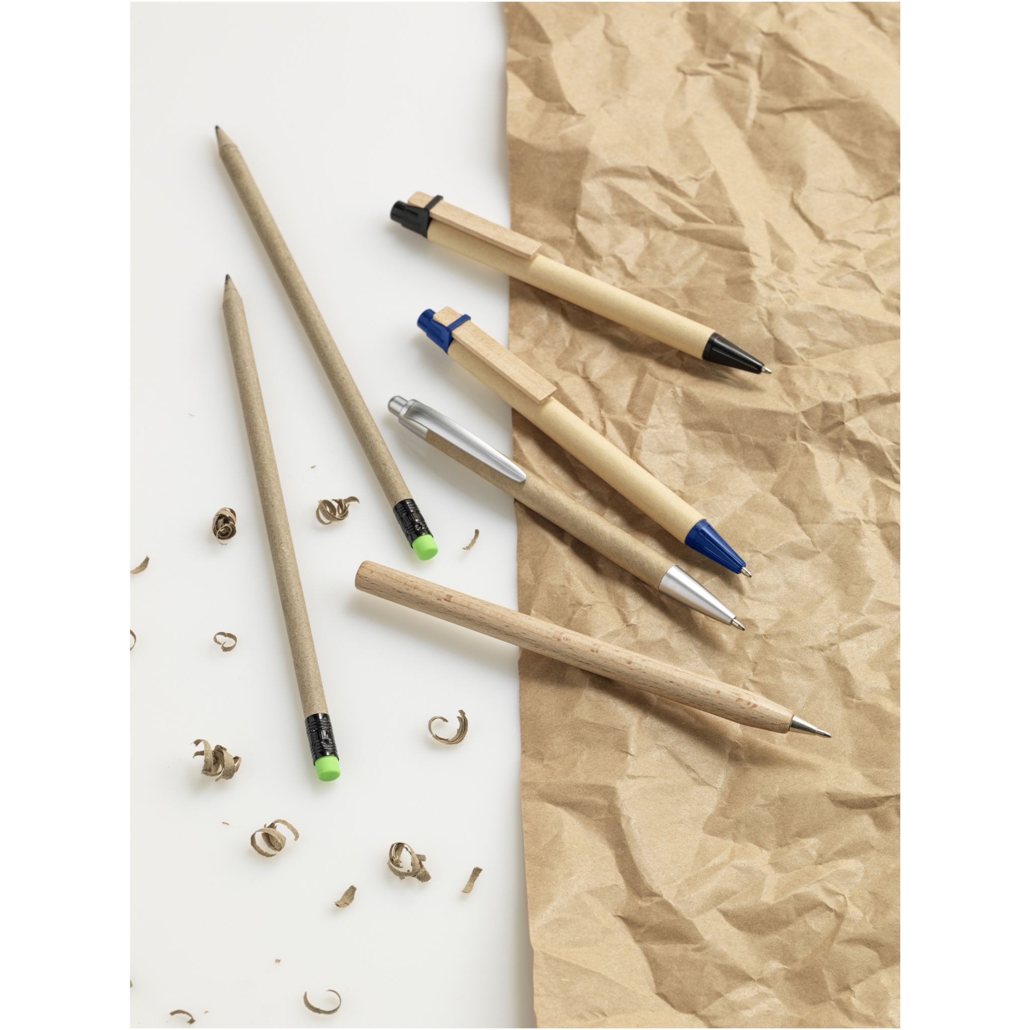 Umweltfreundlicher Kugelschreiber mit Klickmechanismus, einem Schaft aus Recyclingpapier und silberbesprühten Verzierungen aus ABS-Kunststoff. Die Farbe des Recyclingpapiers kann variieren.