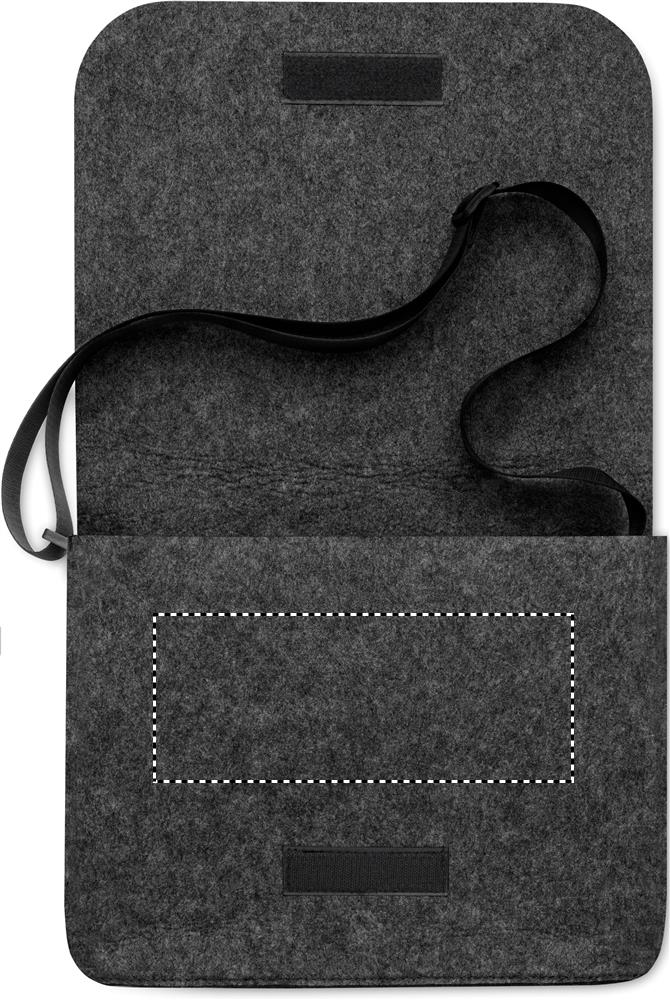 Umhängetasche aus RPET-Filz. Klettverschluss und Umhängegurt. Bietet Platz für einen 15'' Laptop.