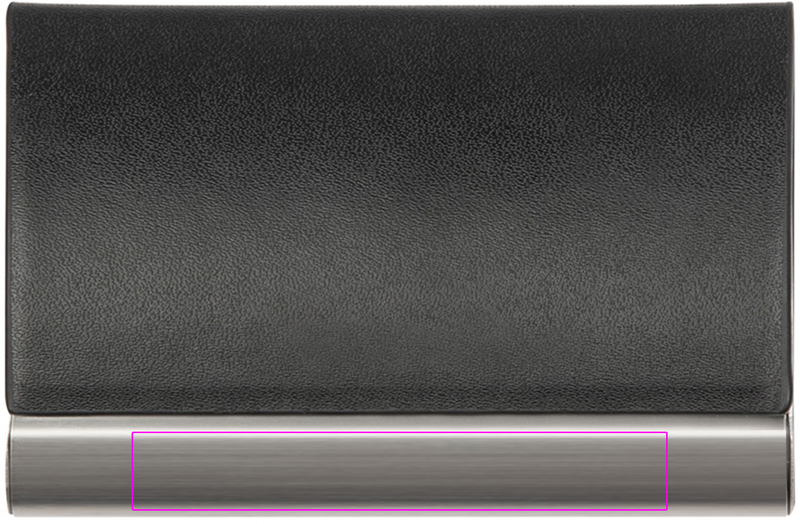 Visitenkartenetui aus Metall mit Kunstlederüberzug und Magnetverschluss. Das Logo ist auf den Metallstreifen gelasert.