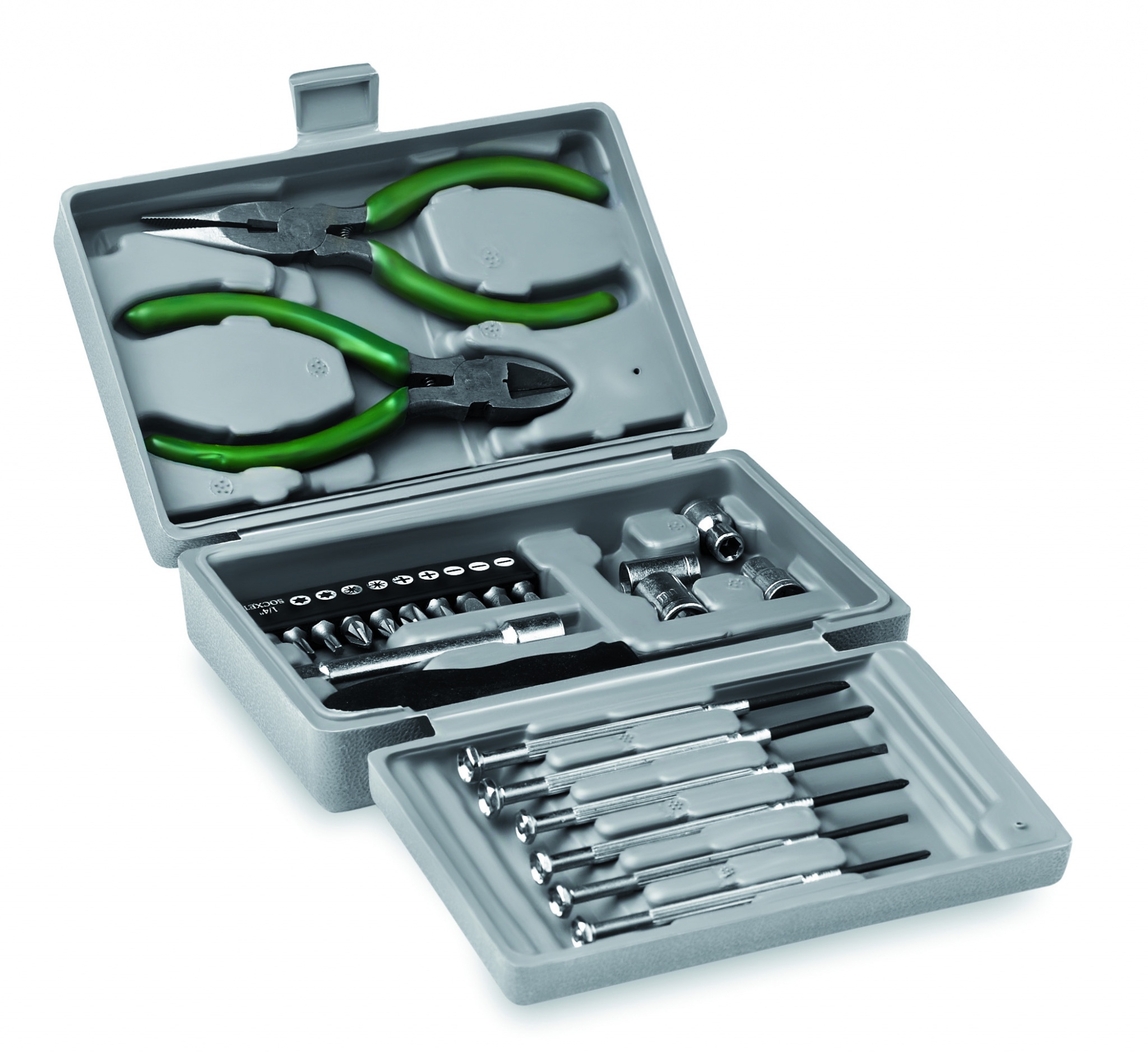25-teiliger Werkzeugkoffer. Inklusive Pinzette, 6-teiliges Schraubenzieher-Set, Steckschlüsselsatz, Zange, Schneidezange und 10 St. Bits in einer Kunststoffbox.