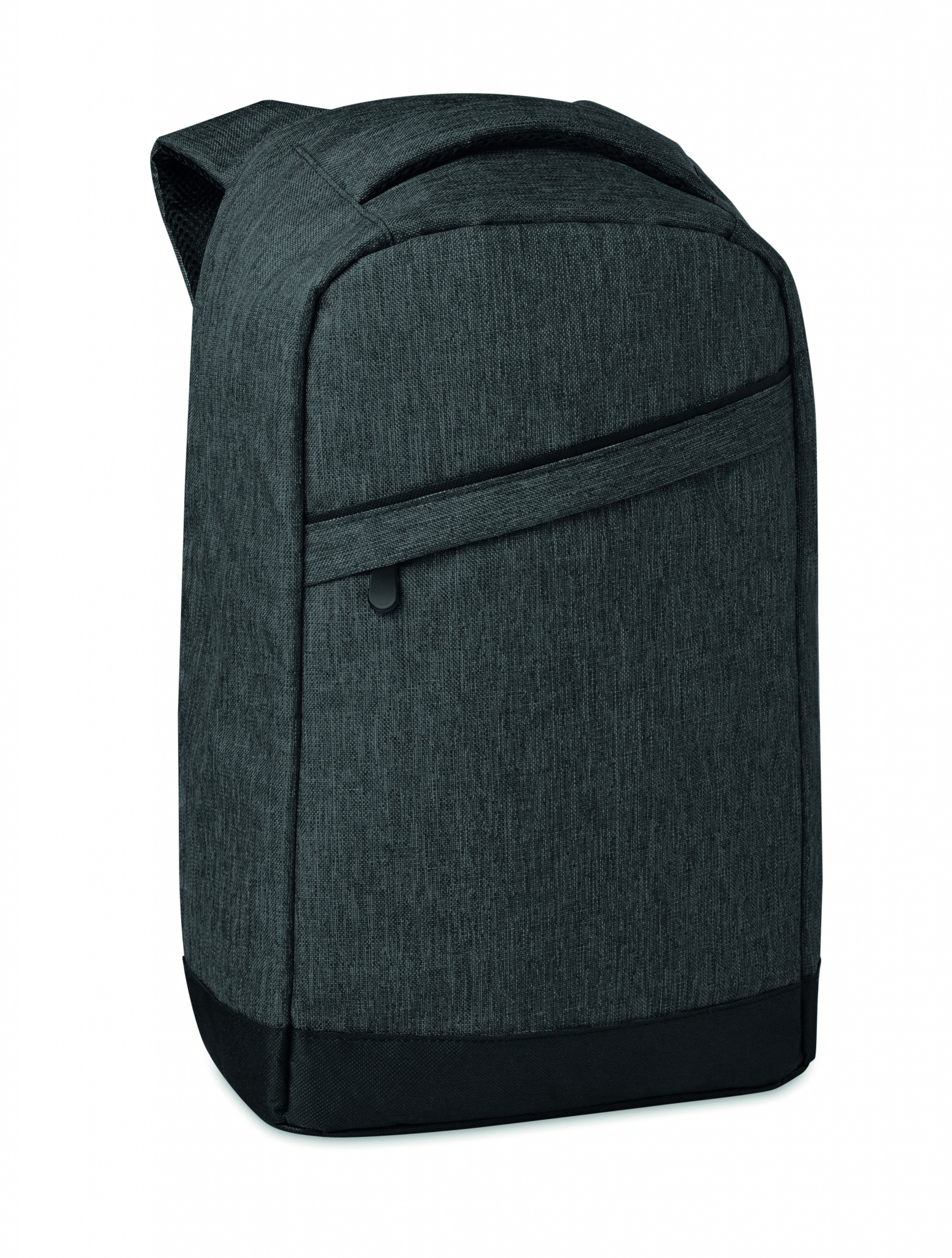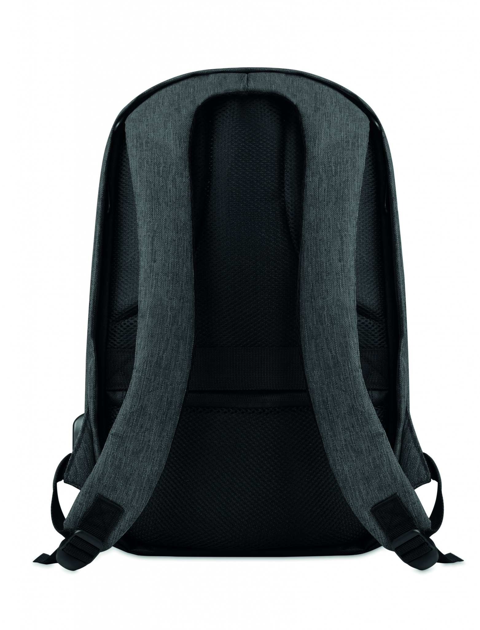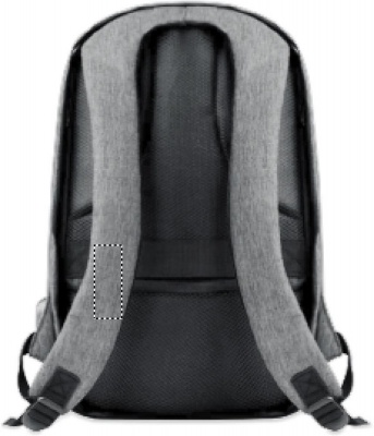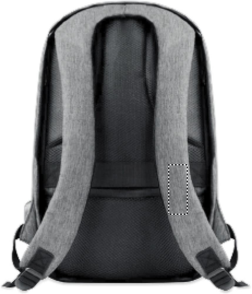 600D 2 tone Polyester backpack with padded shoulder strap with main internal compartment. Includes one internal 13'' laptop compartment and an USB charging cable. Zipper main compartment on backside for better protection.