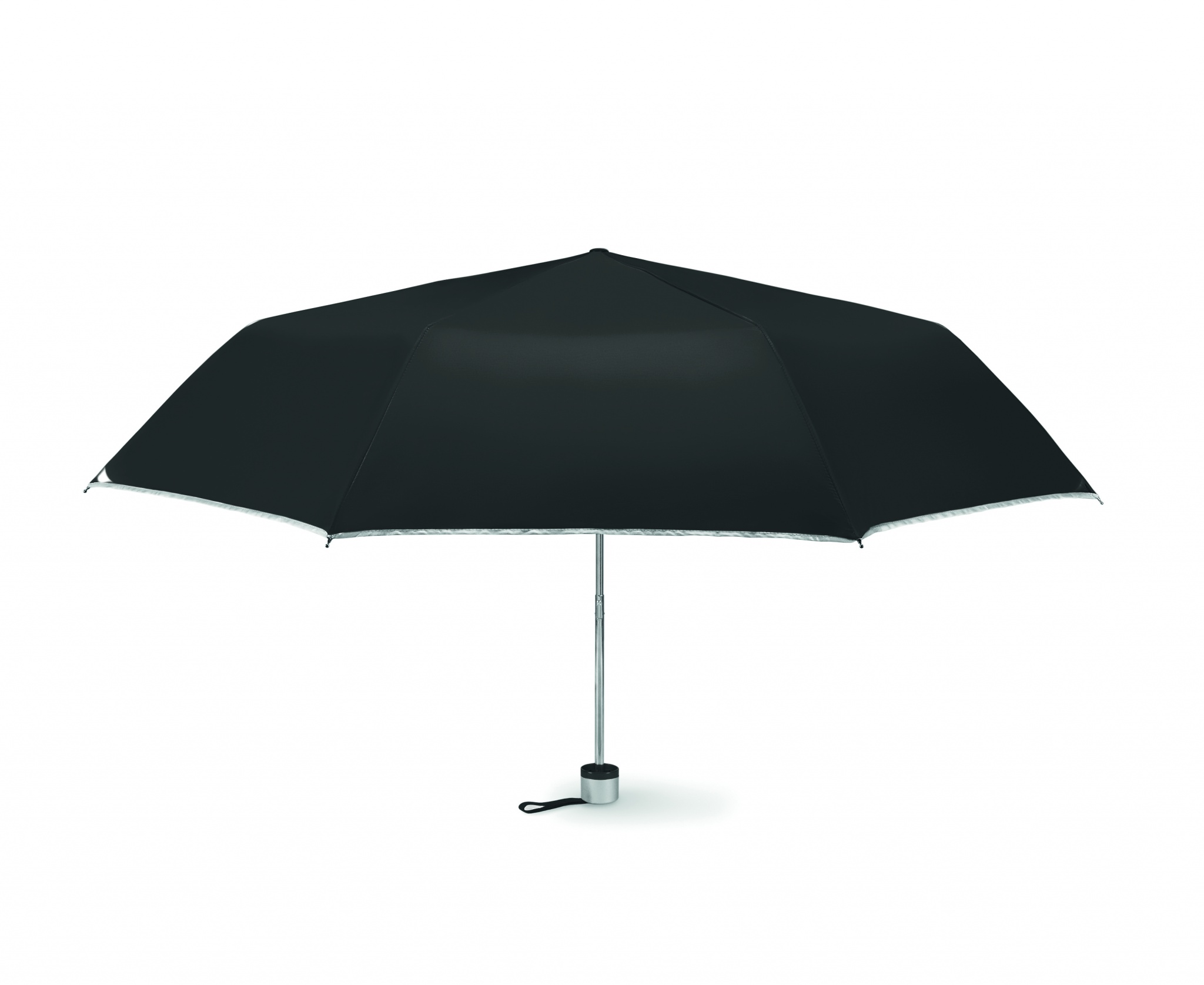 21 inch manual open umbrella in 190T polyester with zincify plating metal shaft and tips. Black plating metal ribs. Panels in colour with silver coating on back. Plastic handle in color with silver rim and black wrist strap. 3 sections fold. Includes matching pouch with silver trim. Manual closure.
