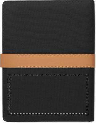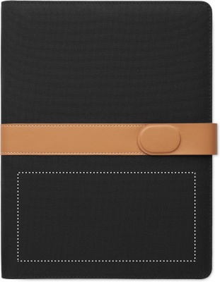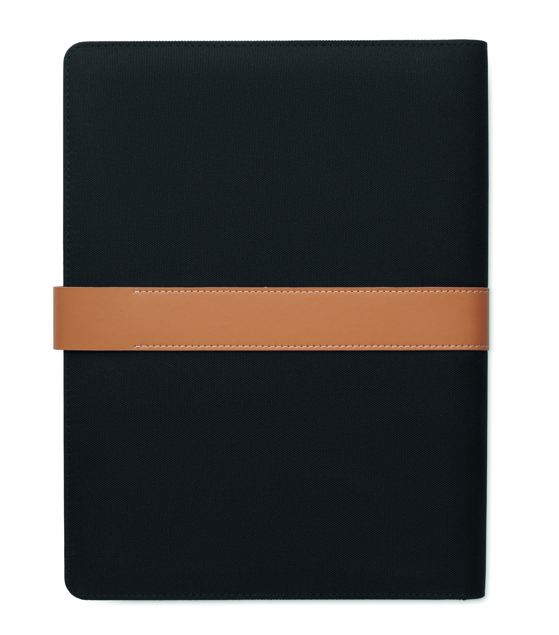 A4 portfolio in RPET with faux leather details. Replaceable A4 notepad.30 recycled paper lined pages. Pen holder. 4 cardholders, 3 small pockets and one big compartment. Magnetic strap closure.