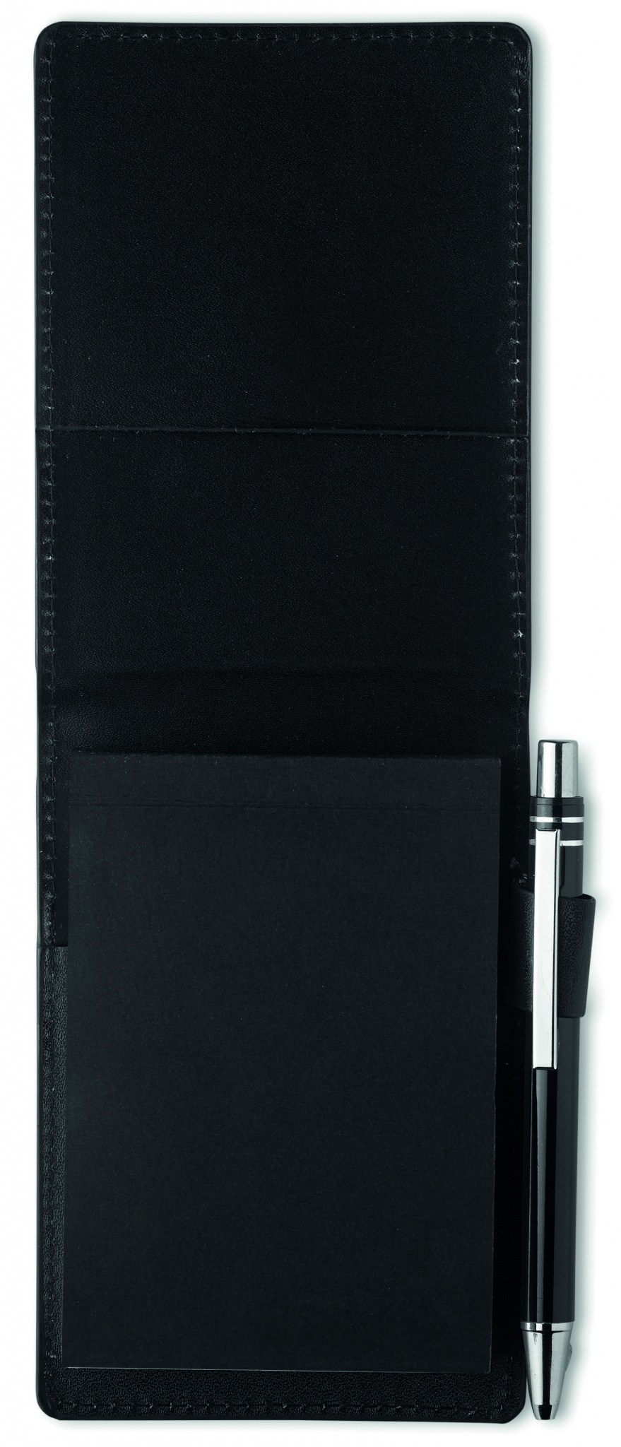 A7 notepad with matching pen. PU pouch with pen holder. 60 plain pre-perforated sheets. Matching metal push button ball pen. Blue ink.