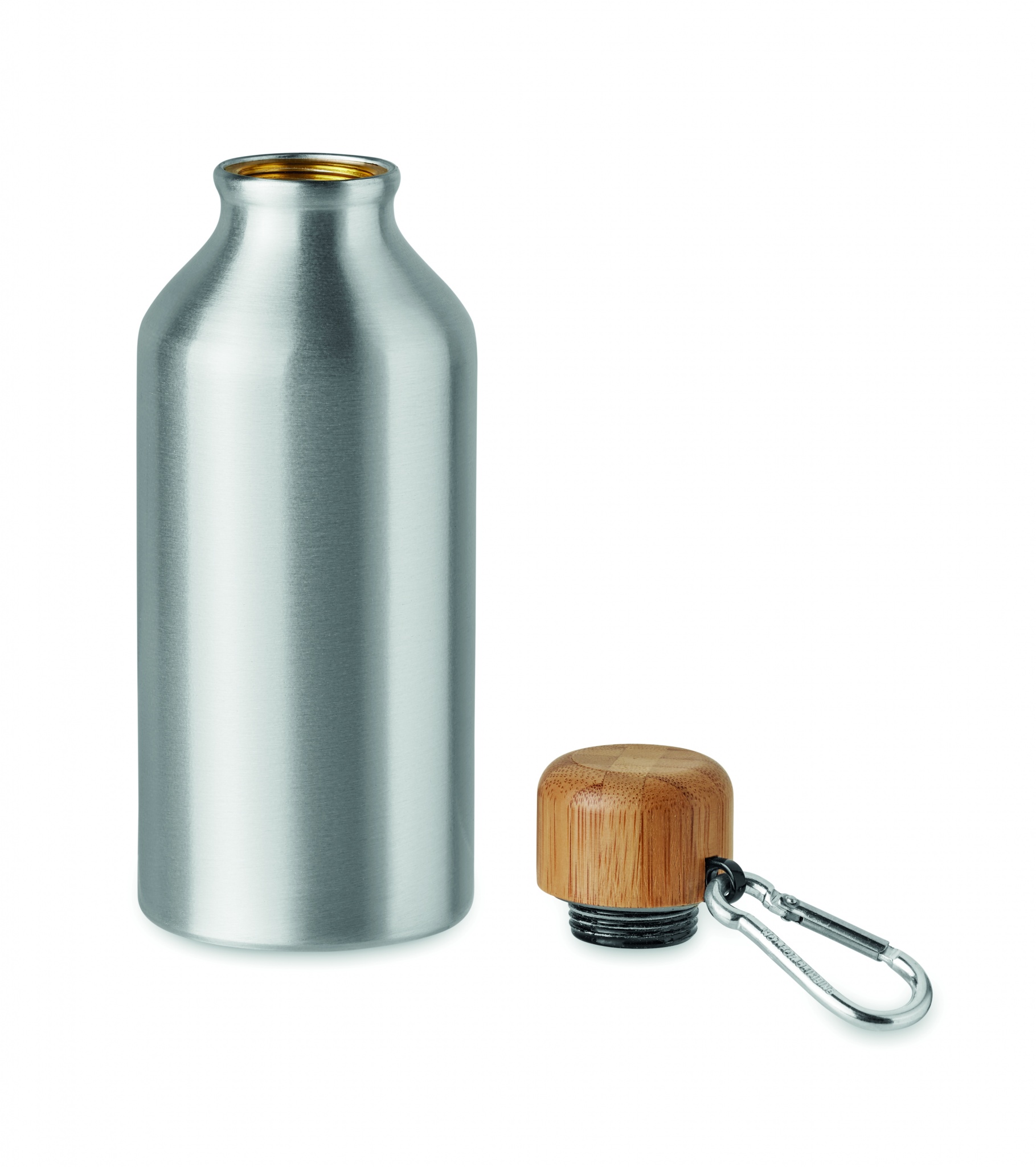 Single wall Aluminium bottle with bamboo lid and carabiner. Capacity: 400 ml. The carabiner is not for climbing (non professional use). Bamboo is a natural product, there may be slight variations in colour and size per item, which can affect the final decoration outcome.