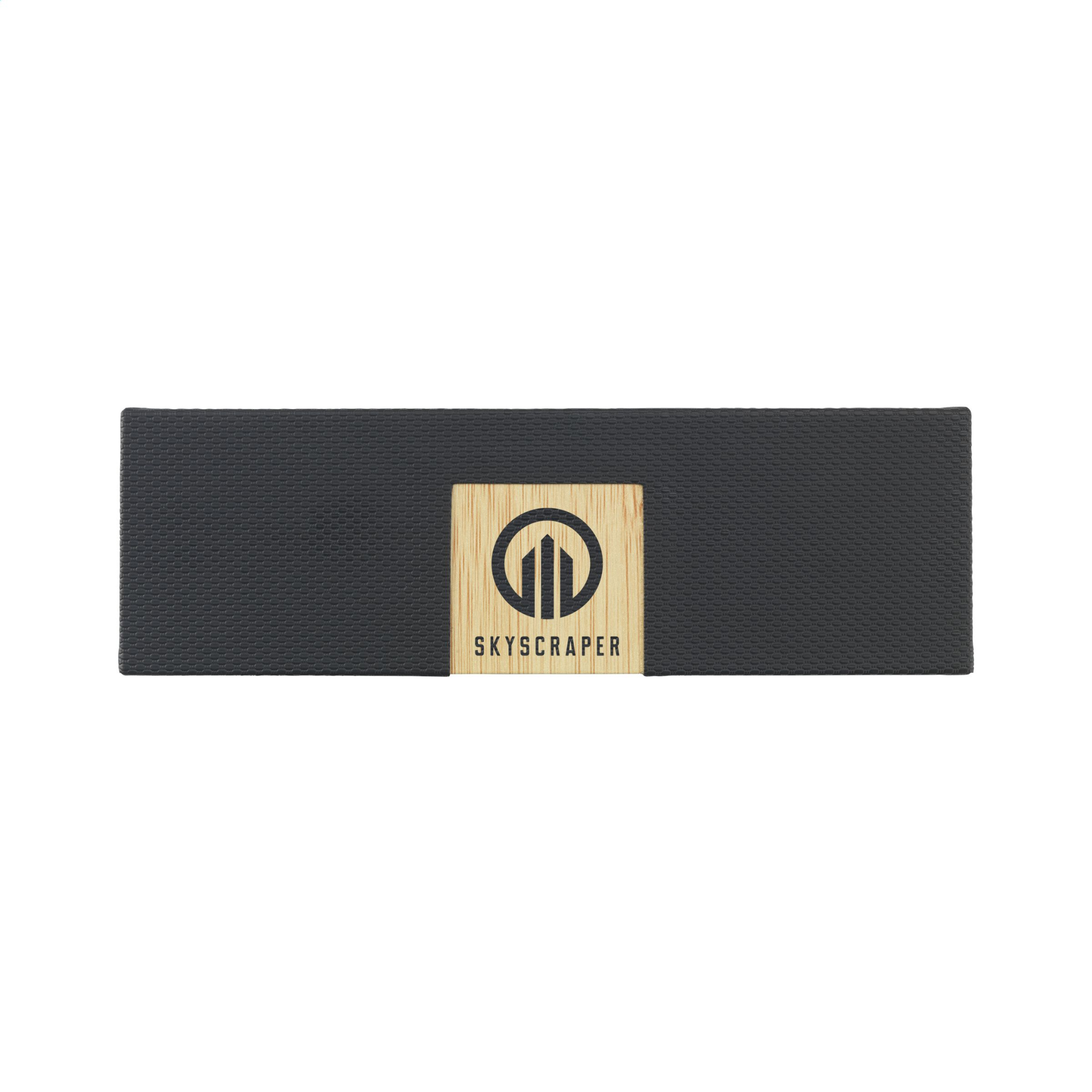 Blue ink, metal ballpoint pen with a polished, super-smooth chrome finish and a bamboo grip. The pen has a turn-click system. Presented in a beautiful, matching box with bamboo accent. A distinctive and luxurious set. Each item supplied with an individual kraft sleeve.