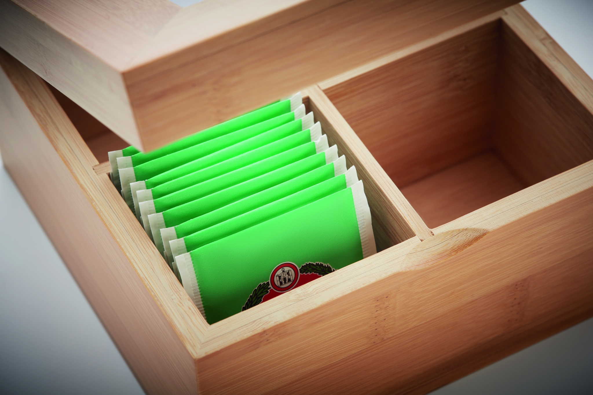 Bamboo tea box with transparent glass lid. Within the 4 equally divided compartments you can easily hold up to 24 teabags. Bamboo is a natural product, there may be slight variations in colour and size per item, which can affect the final decoration outcome.