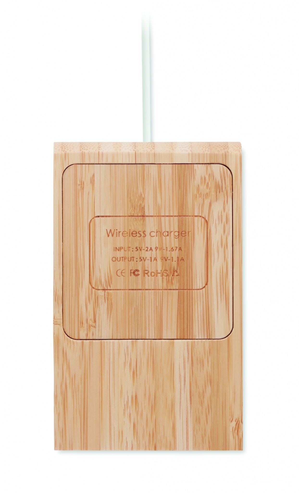 10W Bamboo wireless charger with stand functionality. Output: DC 9V/1.1A suitable for quick charging. Compatible with latest Androids, iPhone® 8 and newer. Bamboo is a natural product, there may be slight variations in colour and size per item, which can affect the final decoration outcome.