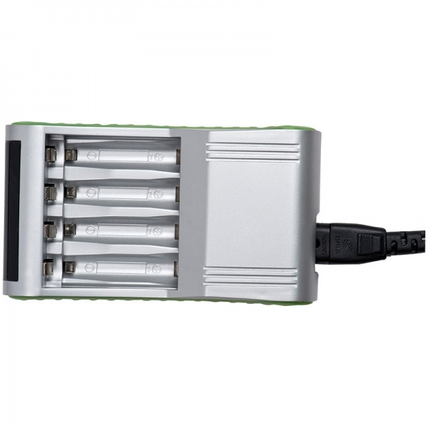 This battery charger is a real innovation. You can charge and reuse up to 4 alkaline batteries (AA / AAA Alkaline) or even NiMH batteries within two hours. Includes a power plug. We print your logo on the silver surface.