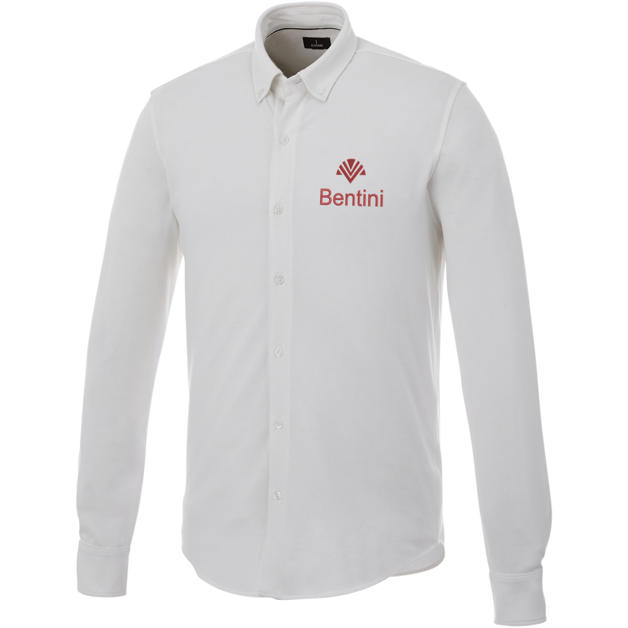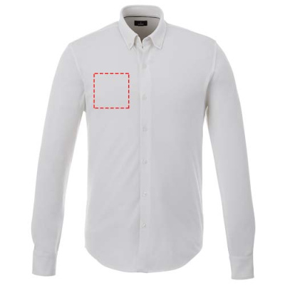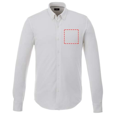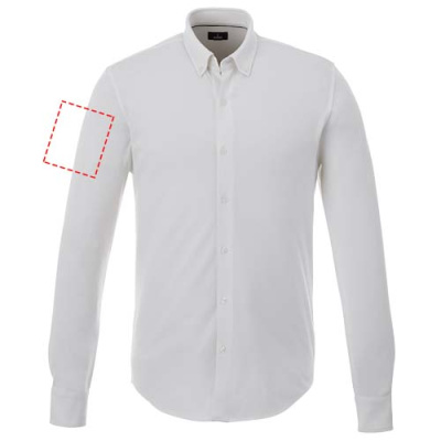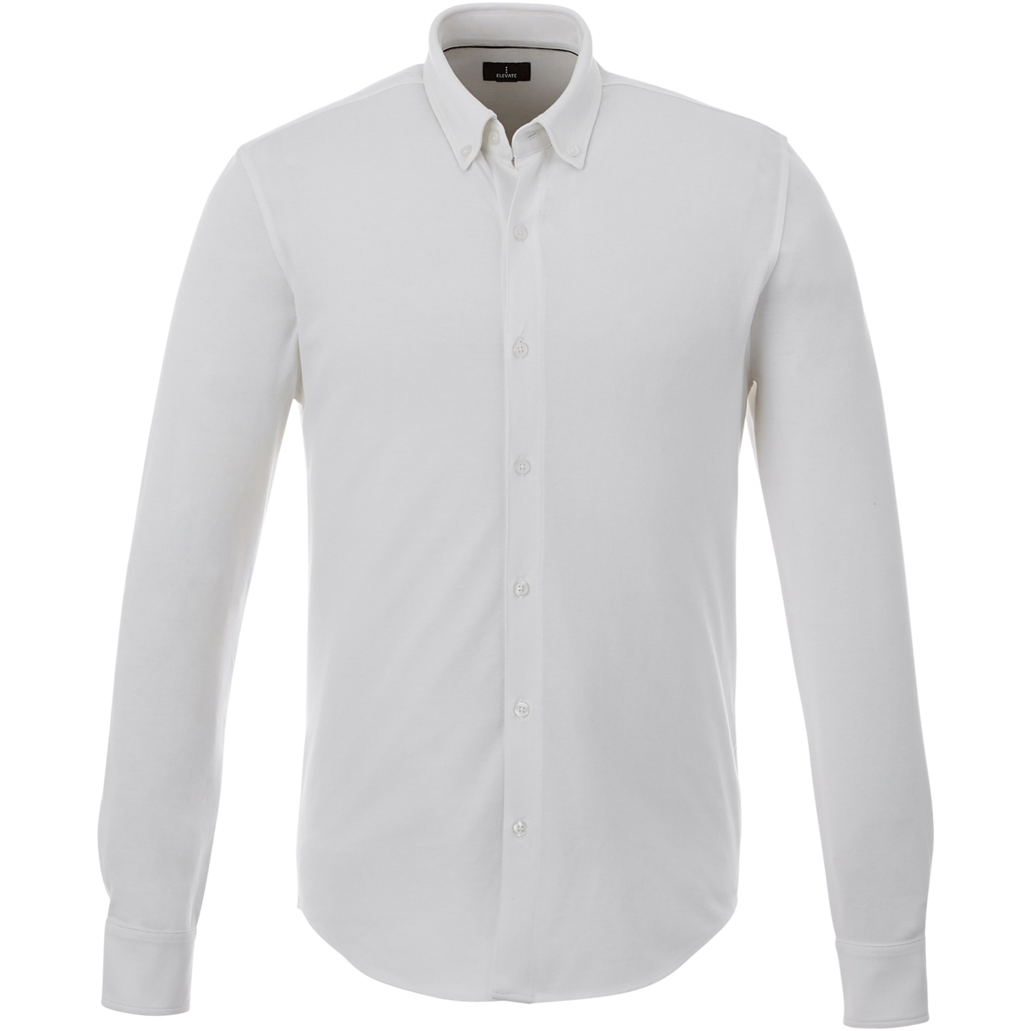 Self fabric collar. Stretch fabric. Adjustable cuff with single pleat. Button-down collar. Satin piping at inside neck. Dyed-to-match engraved buttons. Woven main label.