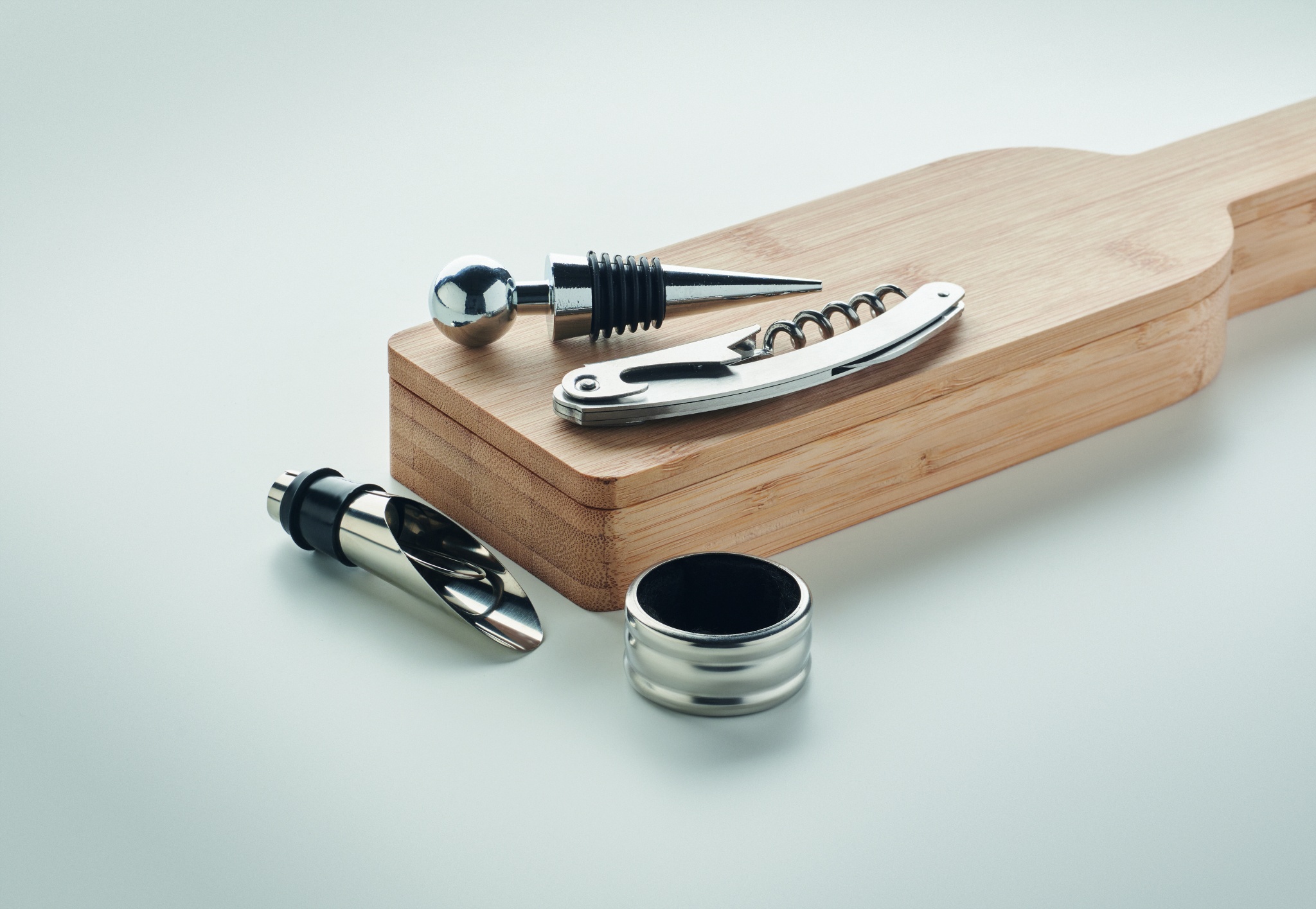 Bottle shape wine set in bamboo case. Including corkscrew, wine pourer, bottle stopper and wine bottle drip ring.