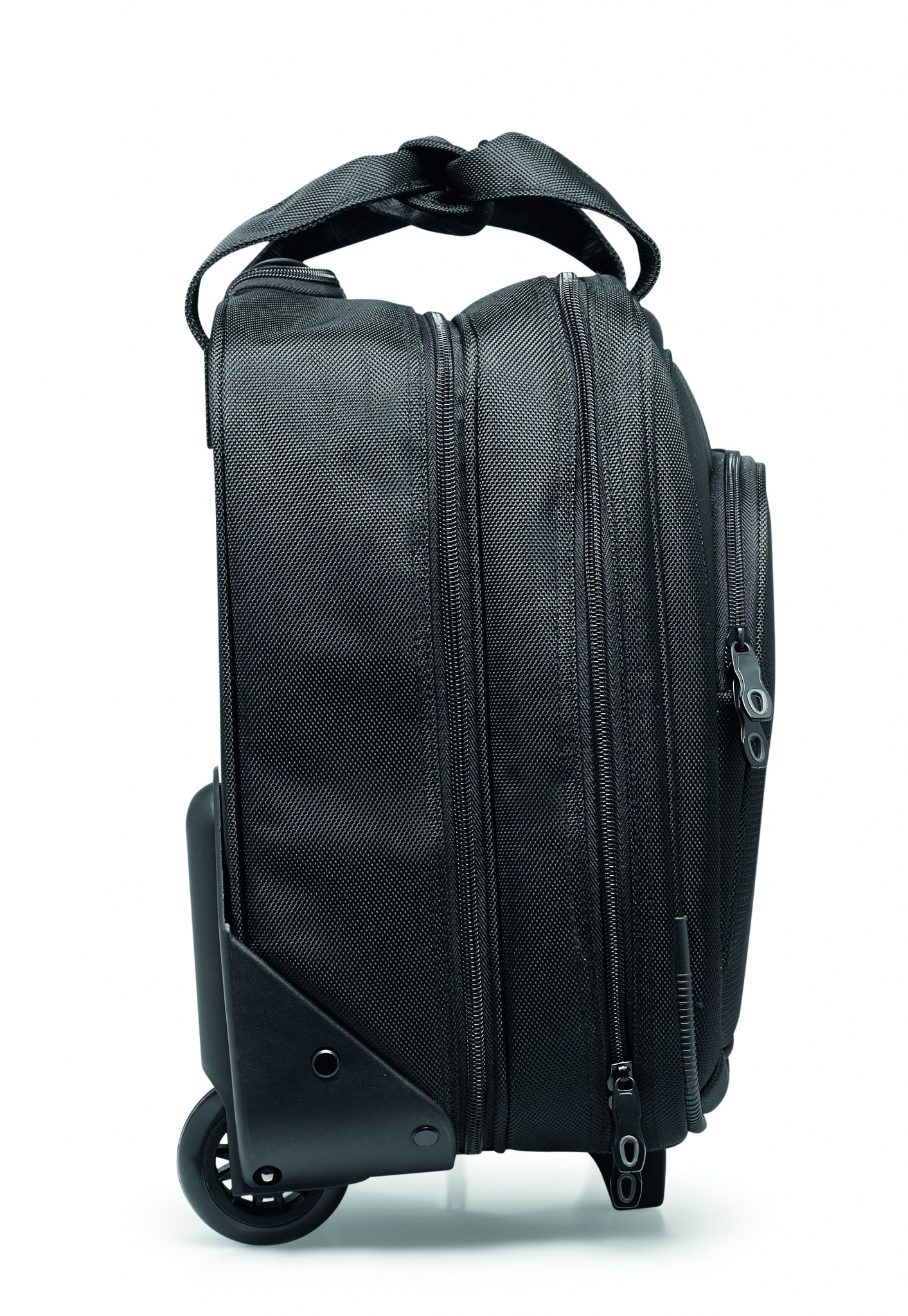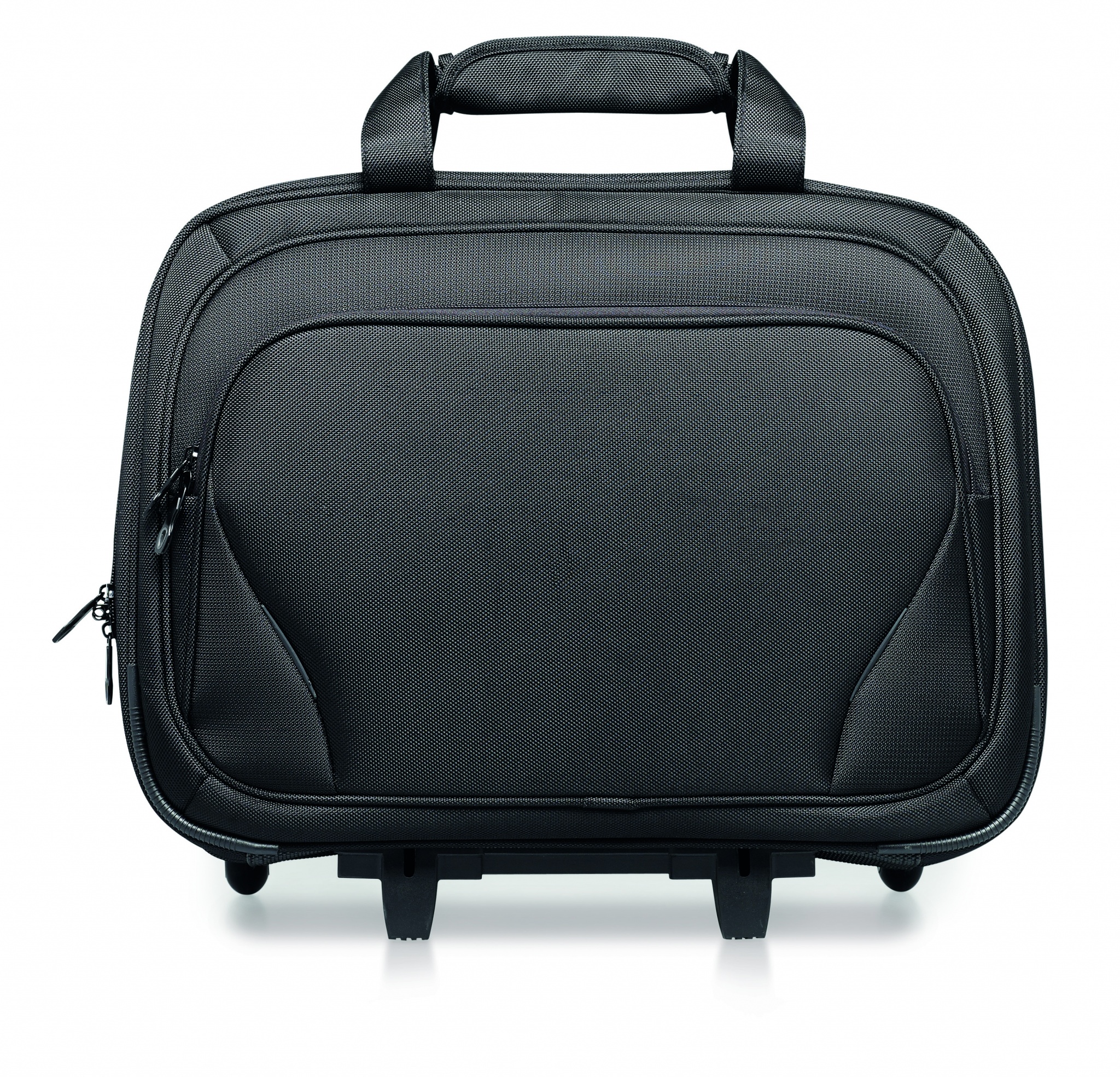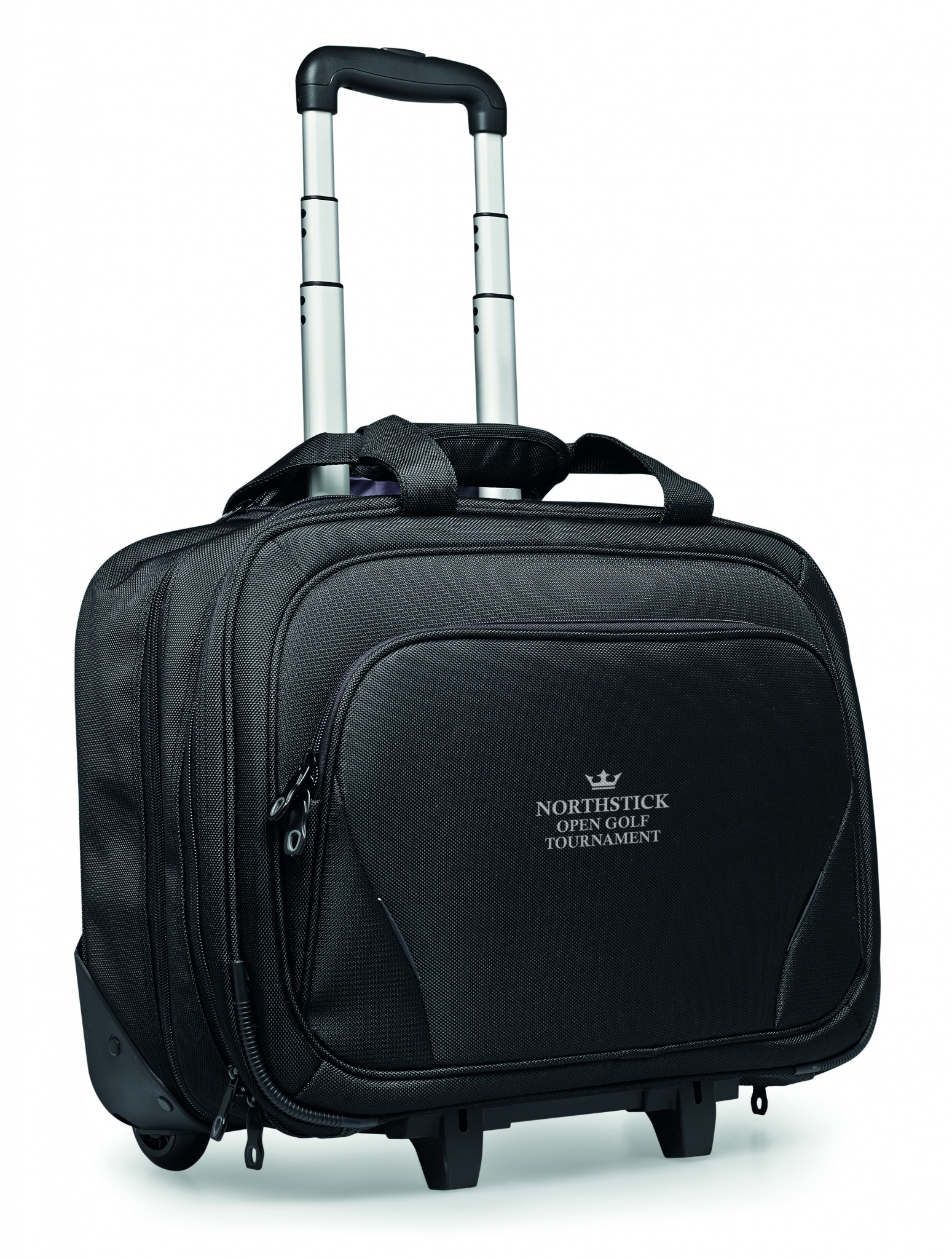 Business trolley including a 17 inch laptop pocket and 10 inch tablet pocket with several compartments. 1680D polyester.