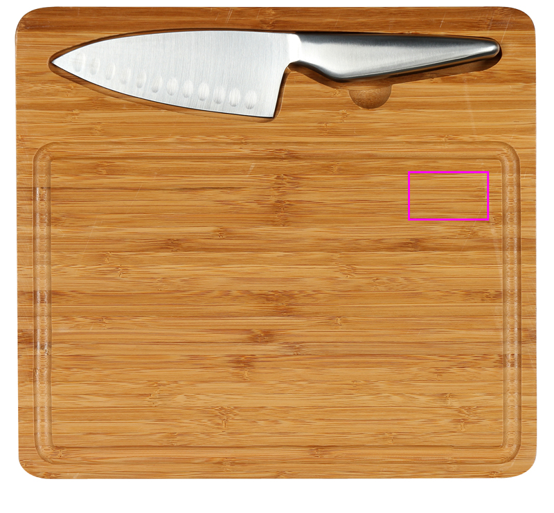 Beautiful cutting board made of bamboo with integrated universal knife made of stainless steel. The knife is fixed by a magnet in the recess. We apply your logo by means of laser engraving on the blade of the knife.