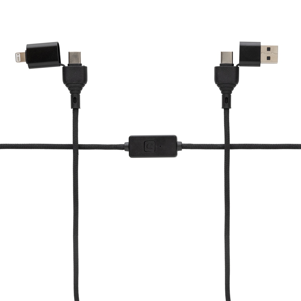 60W charging and data cable that can charge all your mobile devices at top speed and even supports laptop charging. The cable has a unique integrated button to switch off the data transfer function when using the cable in public to avoid data theft or hackers accessing your phone. Simply push the button to activate the protection mode. The cable is made with recycled TPE, PET, ABS and recycled aluminium. 120 CM long and supports Car play and Android auto (type C to type C only) . Total recycled content: 52% based on total item weight. RCS certification ensures a completely certified supply chain of the recycled materials. Packed in FSC mix packaging. PVC free.