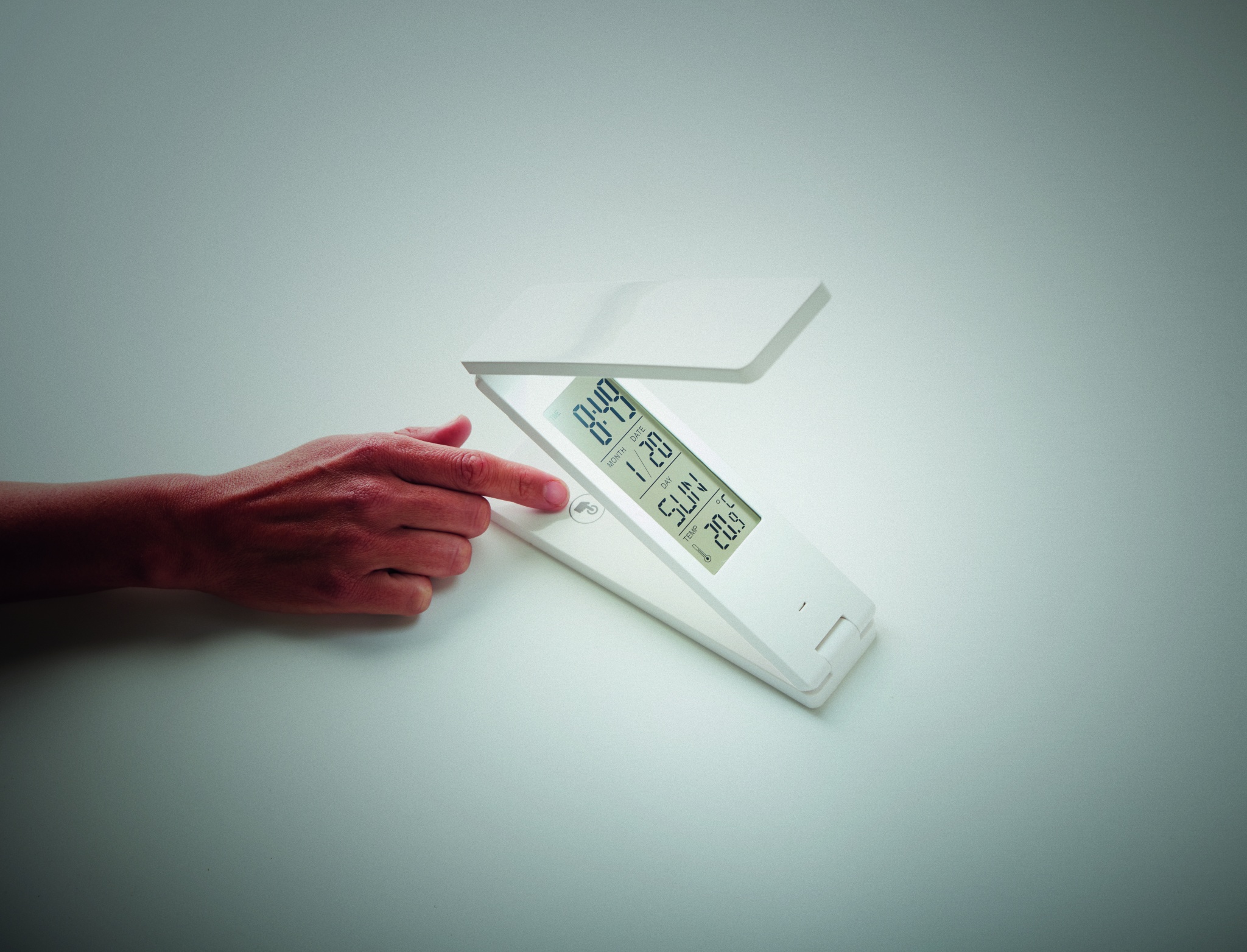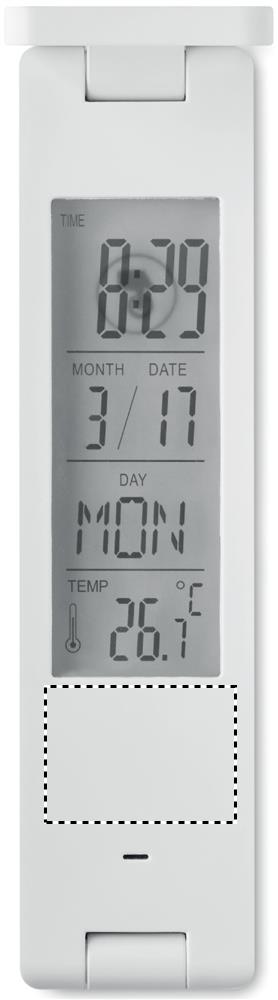 18 LED foldable desktop lamp in ABS. Displays time, temperature. Alarm function. 1 CR2032 battery included.