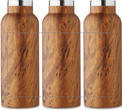 Double wall insulating vacuum bottle in recycled stainless steel (90% recycled stainless and 10% stainless steel) with wooden look and carry handle lid. Leak free. Capacity: 500 ml.