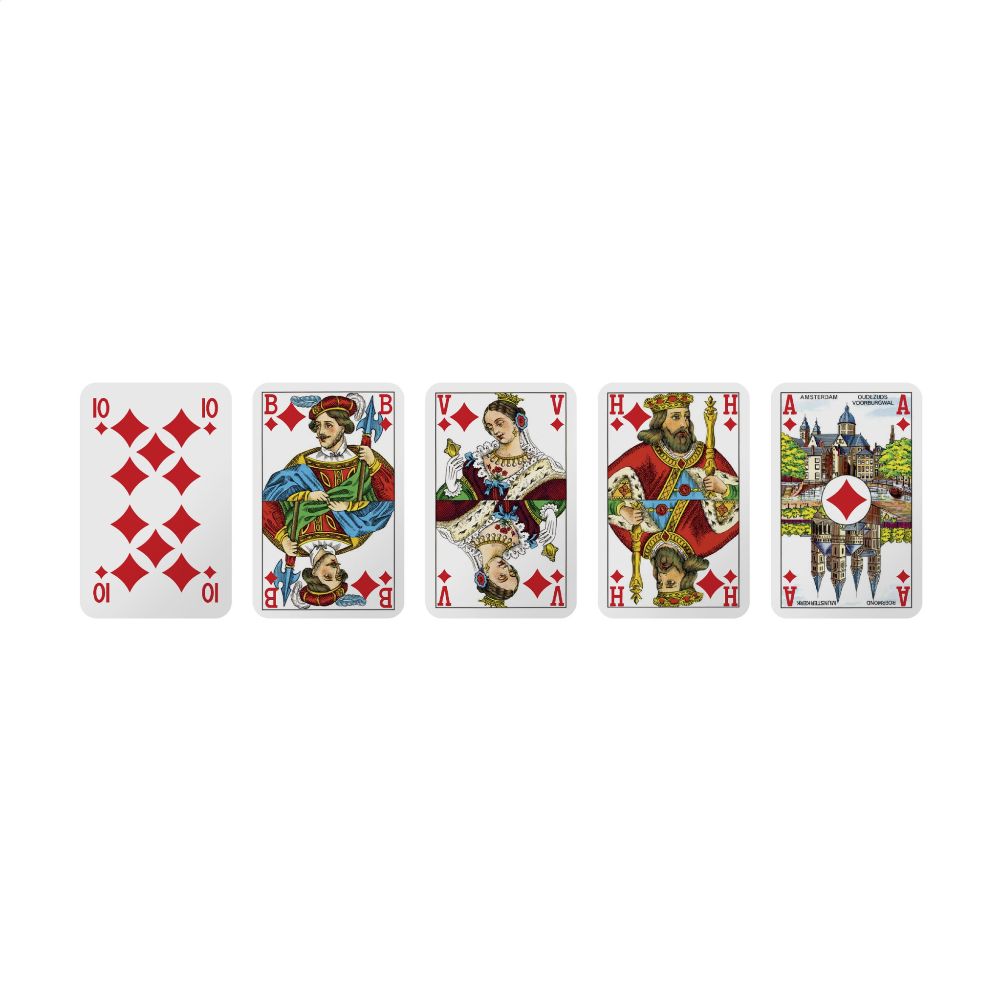 Playing cards made from sturdy 300-gram cardboard. With Dutch images on the front (A/H/V/B) and corner marks. These decks consist of 52 playing cards and 2 jokers. Packaged in a cardboard box with cellophane. You can add your full-colour design onto the back of the cards and also onto the box, creating a unique, personalised deck of cards to promote your brand with every game.