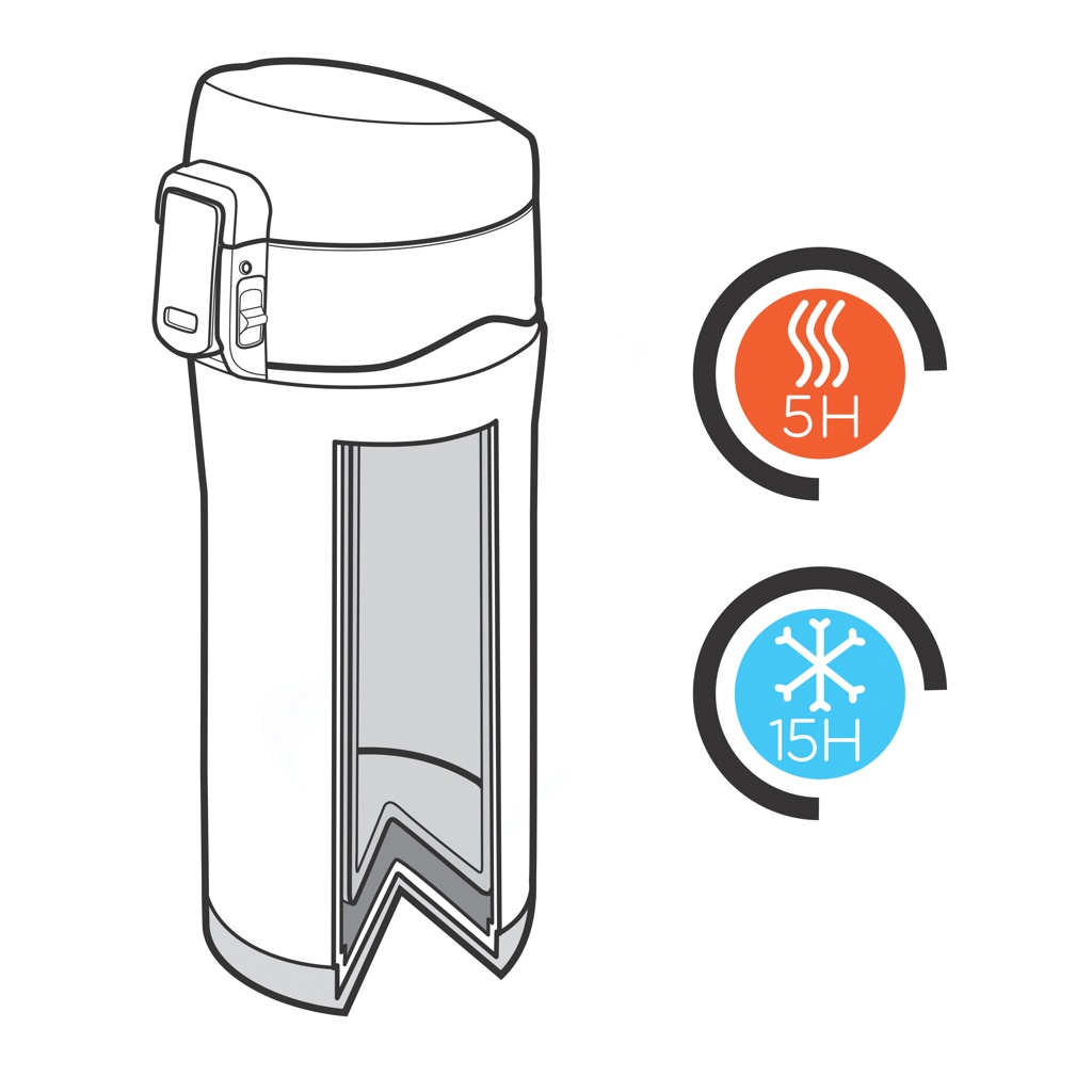 Double wall stainless steel vacuum mug that keeps your drink warm for up to 5 hours or cool up to 15 hours. The lid is lockable and therefore avoids any risk of leaking or spilling. The lid is easy to keep clean for optimal hygiene and can even be washed in the dishwasher. The unique design of the mug allows you to drink conveniently and safely with one hand directly from the mug. The size of the mug is suitable to place in any car drink holder. Capacity: 300 ml.