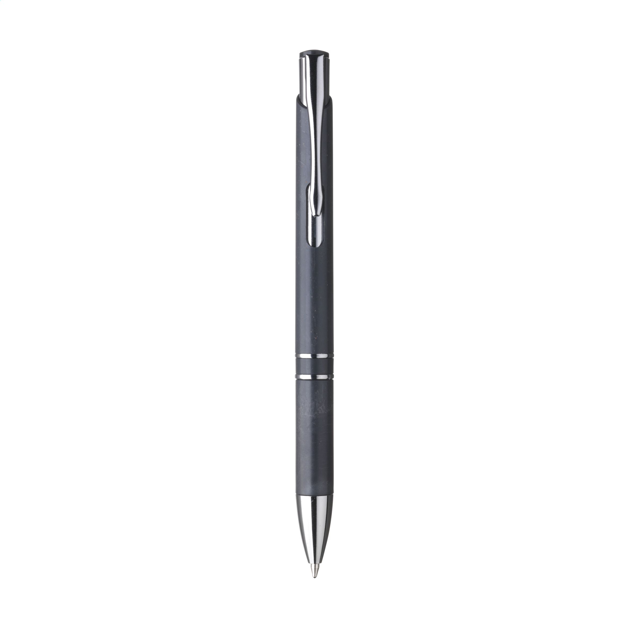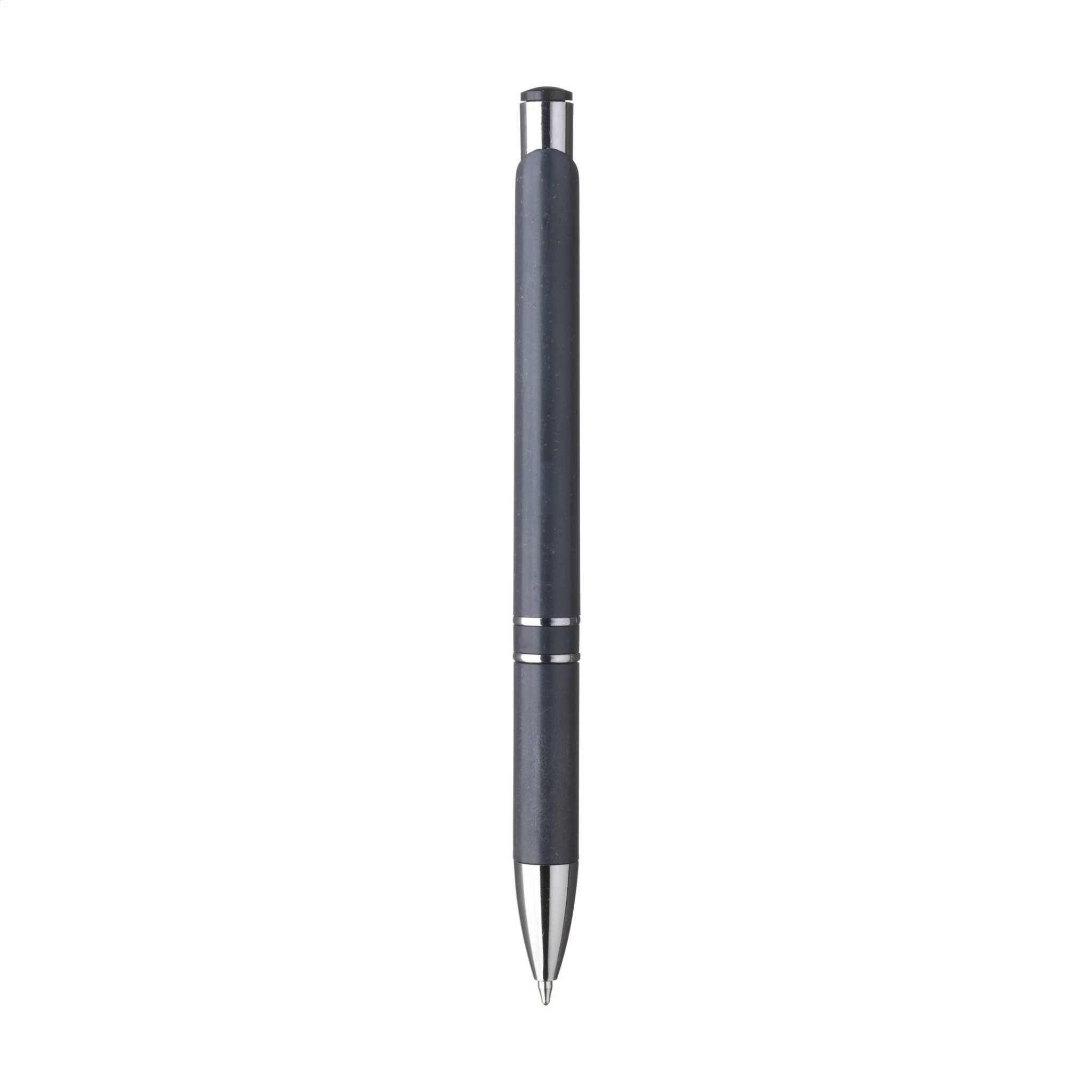 Blue ink ballpoint pen with a barrel made from 50% ABS and 50% wheat straw, metal clip and plastic chrome accents.