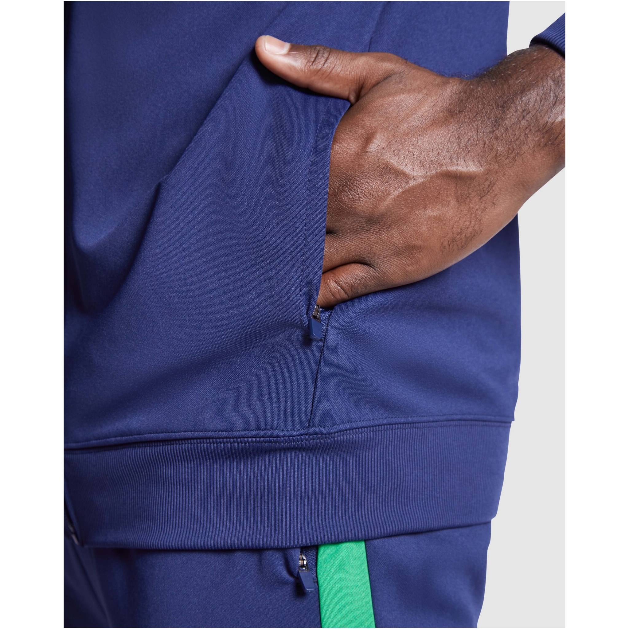 Tracksuit in lightweight and elastic fabric. Jacket with contrasting colour and sewing trims on chest. High collar with contrasting seams. Central front zip. Side pockets. 2x2 ribbed cuffs and waist. Trousers with elastic waistband and drawstring. Contrasting side piece with sewing trim. Zipped hem.