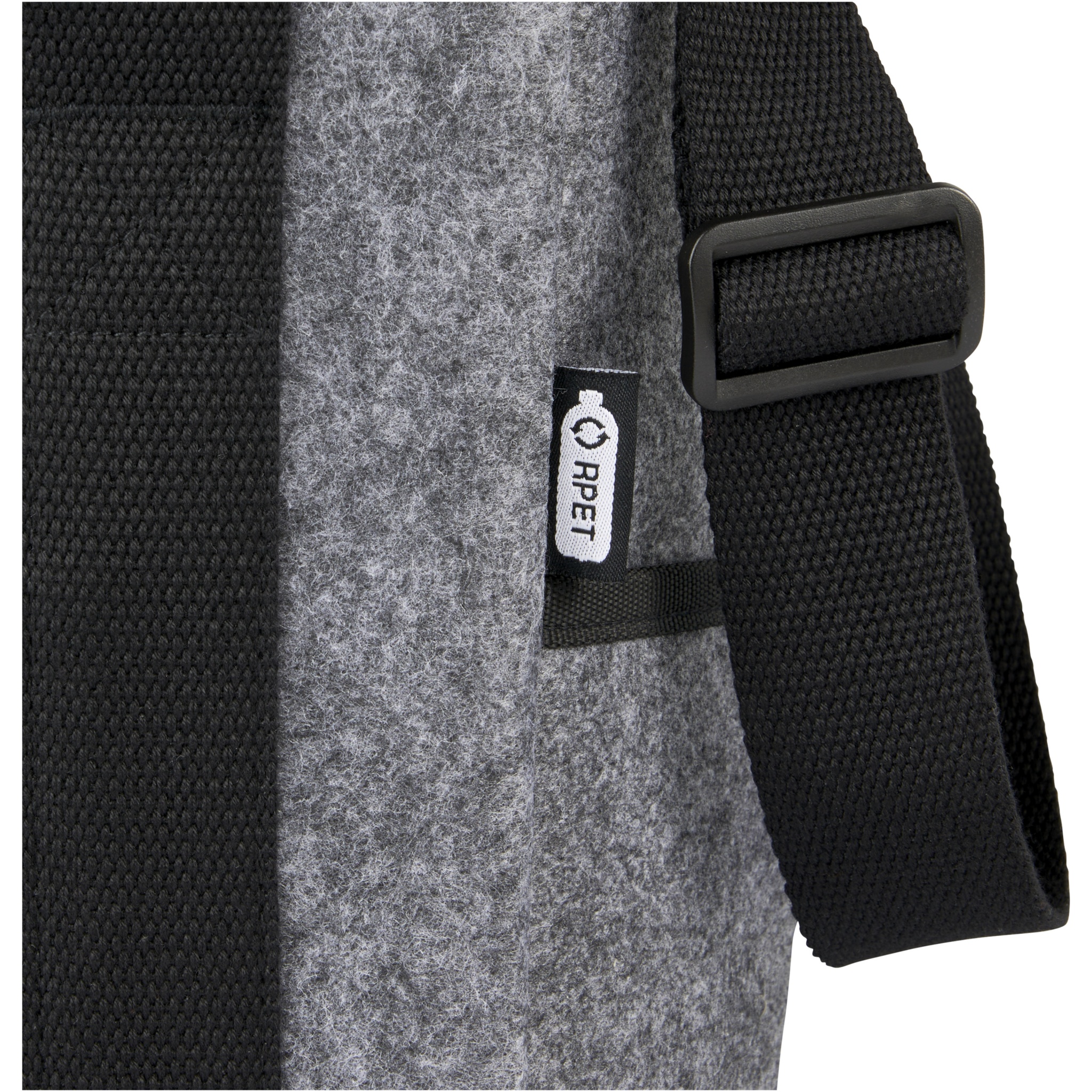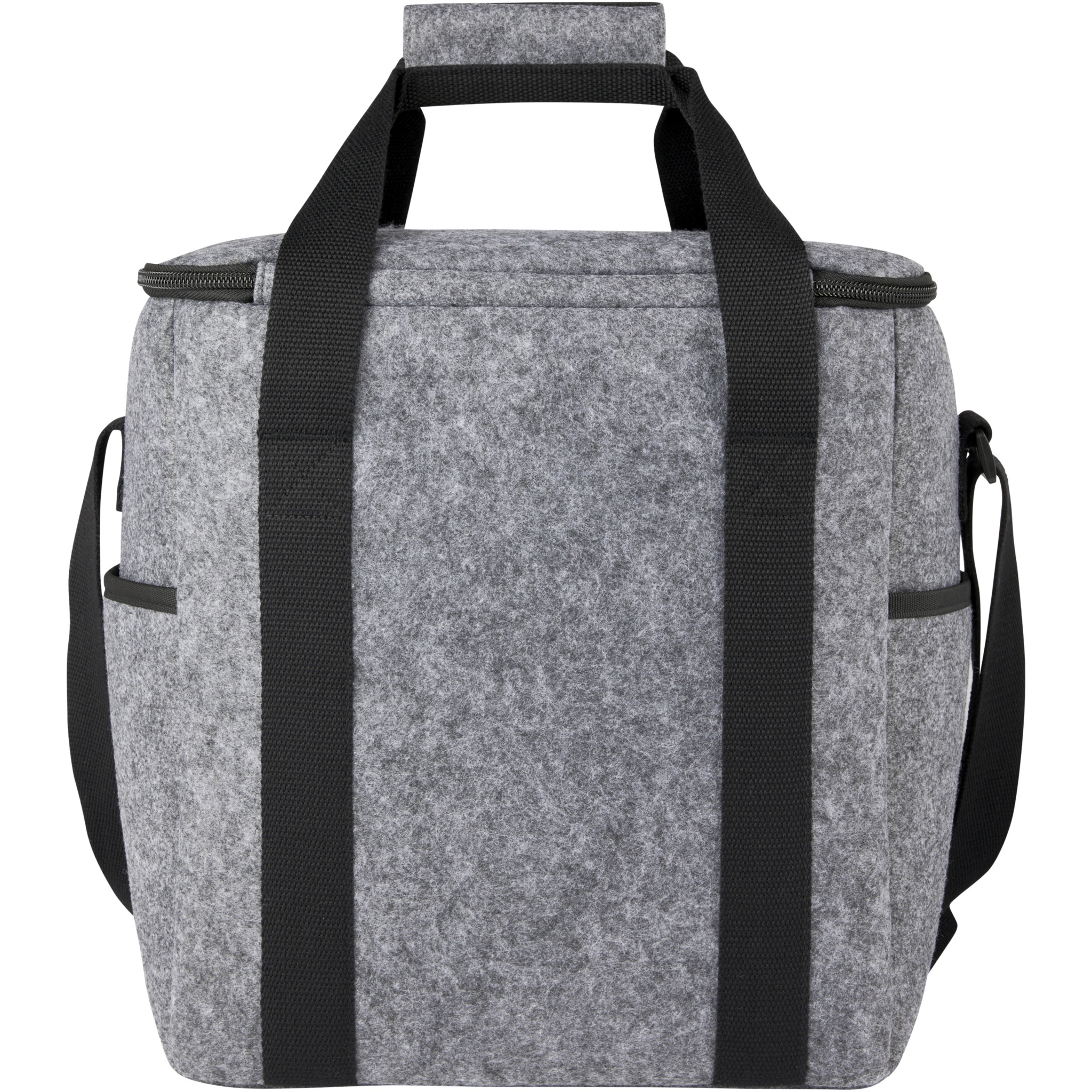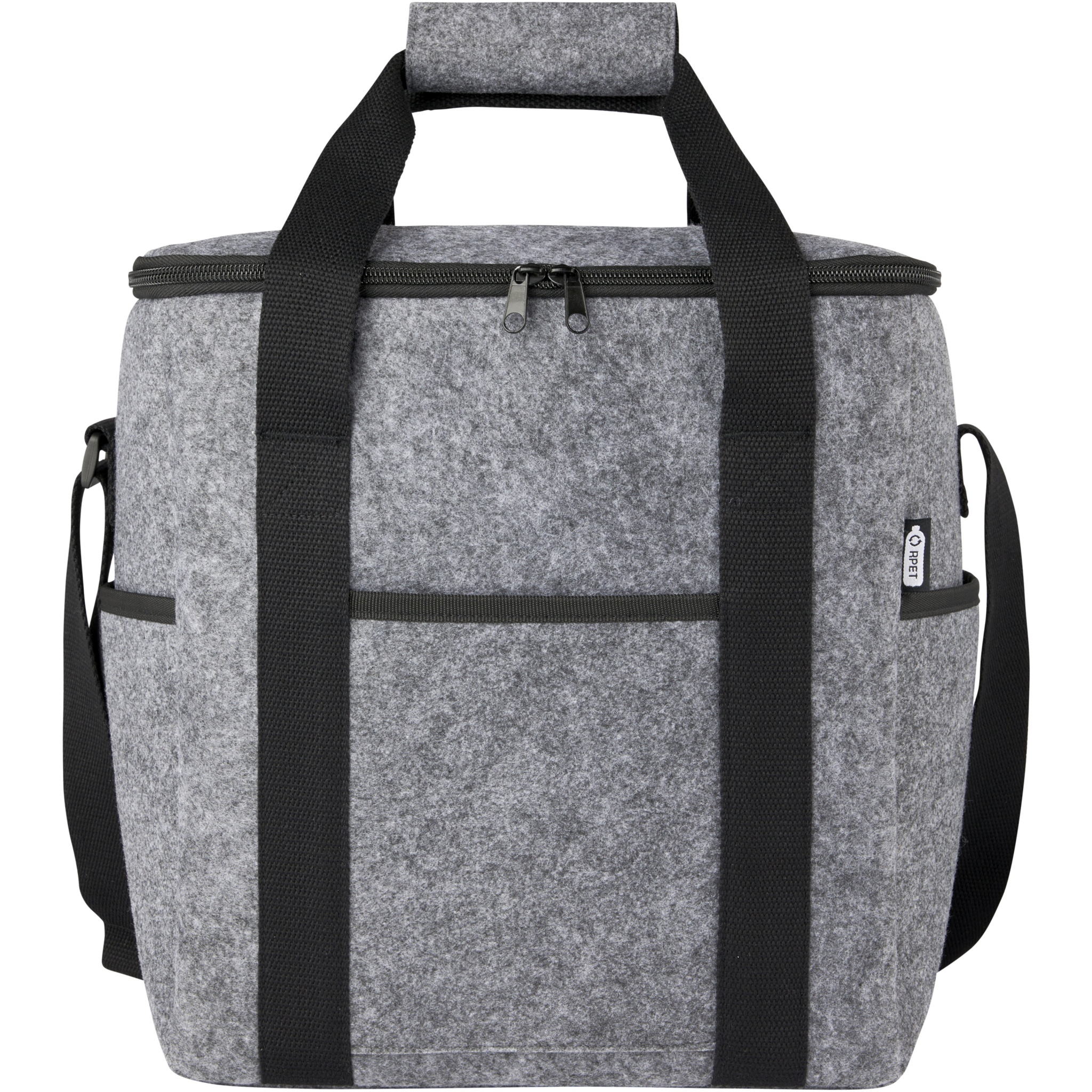 Large cooler bag made of high quality soft and durable GRS certified recycled felt. Features a large main compartment (six 1.5 litre bottles) lined with food safe and extra thick high density thermal PEVA insulation keeping beverages and refreshments cold for hours. Top zipper closure, front pocket, and two side pockets for extra storage. Adjustable long cotton woven shoulder straps (55 x 3.8 cm) and 2 woven cotton carry handles (25 x 3.8 cm) with top hook & loop closing. Easy to clean. Capacity: 21 litres.