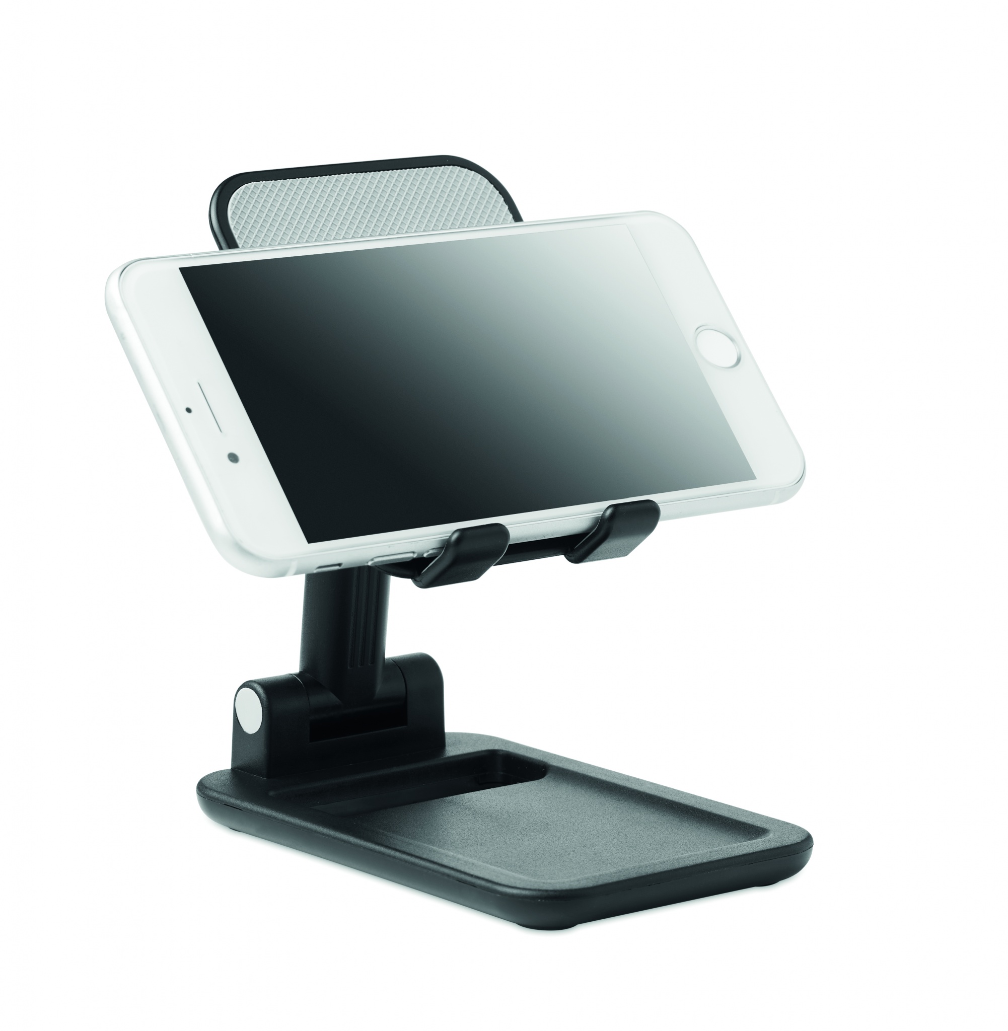 Foldable smartphone or tablet holder in ABS material and base with anti slip. Allows the user to adjust the device for ideal viewing angle.