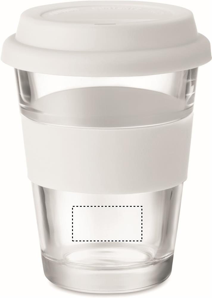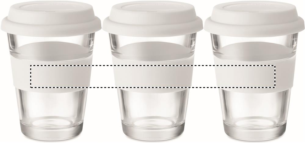 Glass tumbler with silicone lid and grip. Capacity 350 ml. As this is a single wall mug heat transfer can still occur.