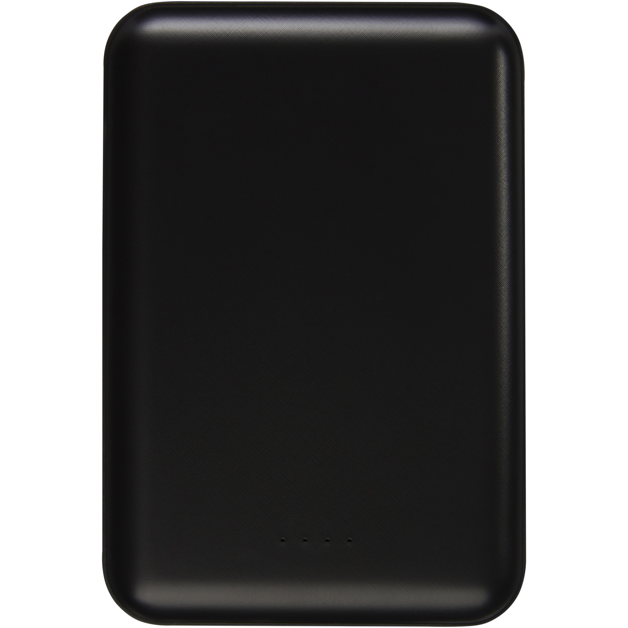 Flat and durable power bank with a 5000 mAh polymer battery. Can be laser engraved on the front panel, which will light up the logo when the power bank is turned on or being used. Output: 5V/2A. Input: 5V/2A. No accessory cable provided for sustainability purposes.