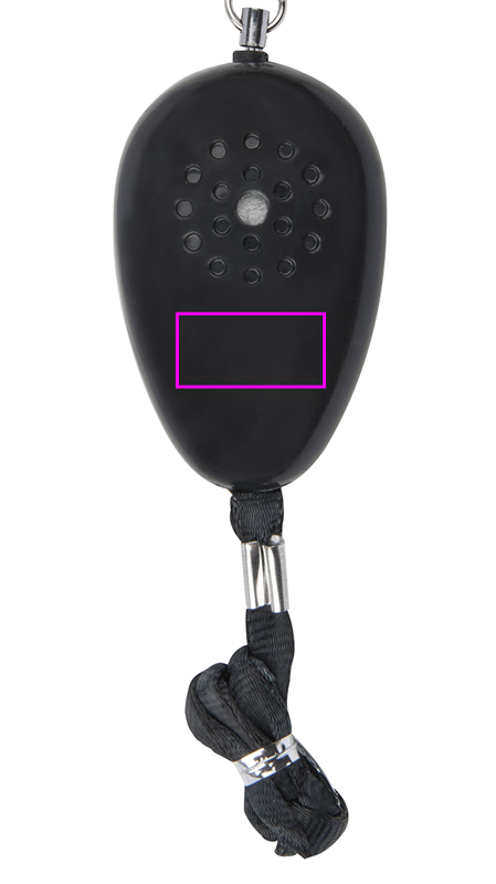 The pocket alarm can be activated by simply pulling out the pin on the keyring. Thanks to the two included safety hooks, it can be fastened almost anywhere. Includes a black drawstring and three LR45 button cells. We print your logo on one side.