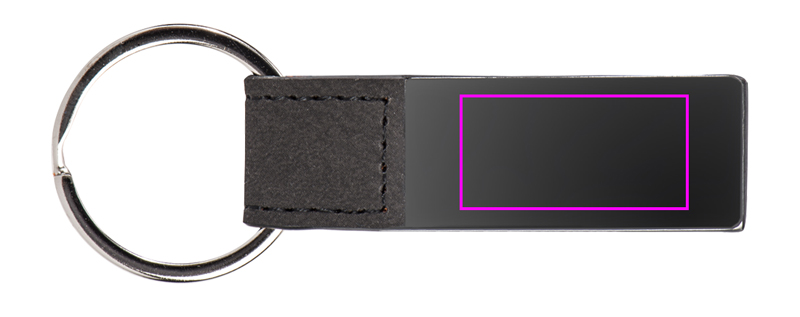 Keychain made of a combination of metal and imitation leather with keyring. Your logo is engraved on the metal surface.