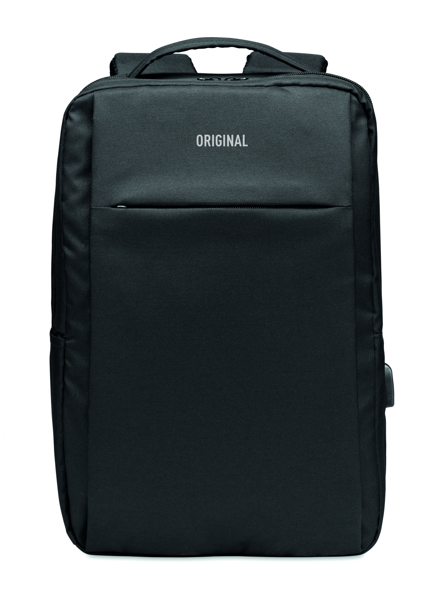 Laptop backpack in 300D RPET Polyester with padded shoulder strap including one main internal compartment for 16 inch laptop and a USB charging cable.