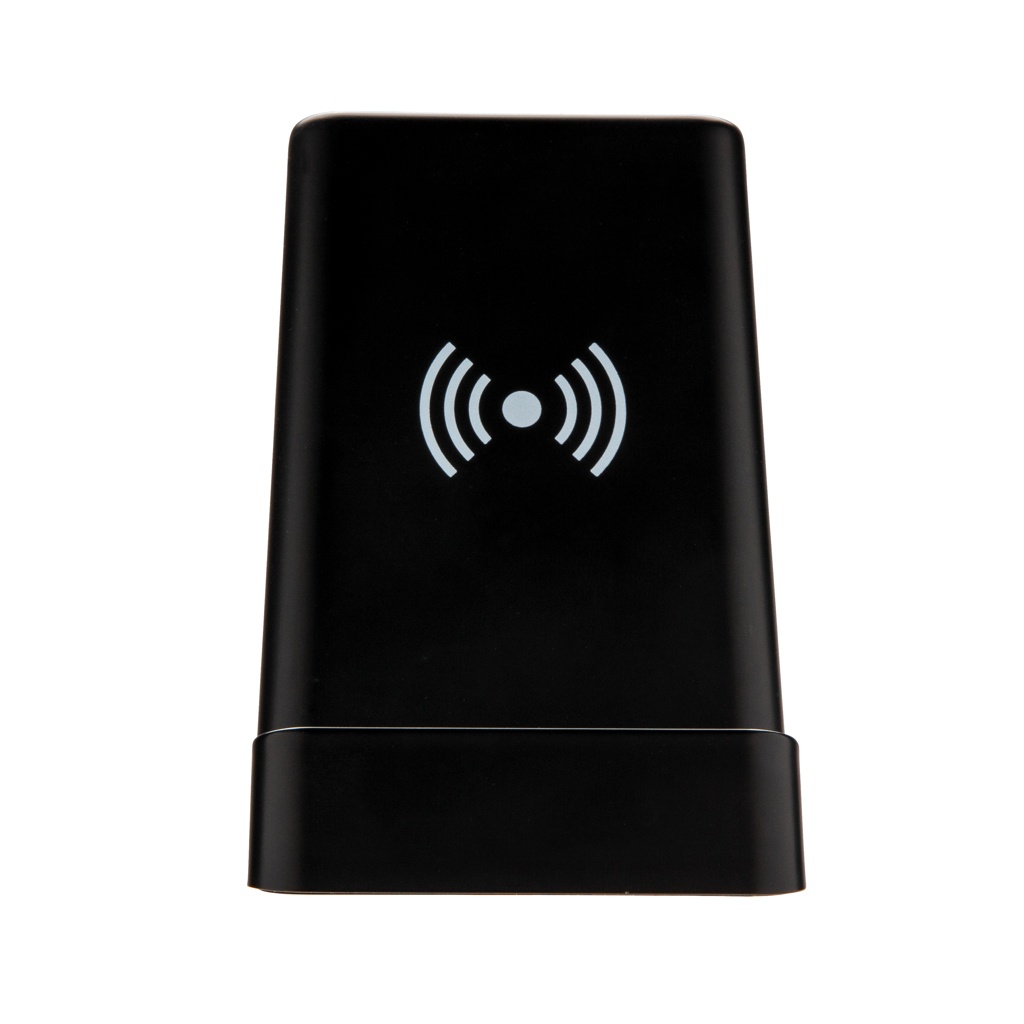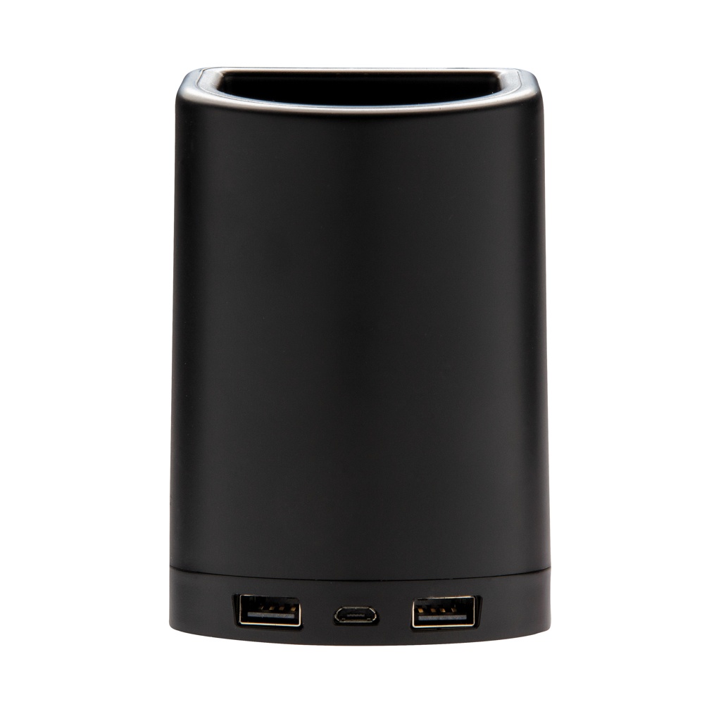 Charge your mobile devices without connecting a cable with this unique two in one desk accessory. Just place your mobile phone on the stand and wait for the charging notification to appear. The charger also allows you to store your stationery accessories like pens or pencils. This charger gives you the option to decorate with your own logo on the item, once connected it will light up for optimal exposure. Compatible with all QI enabled devices like android latest generation, iPhone 8 and up. Input: 5V/3A. Wireless Output: 5V/1A 5W. Including 150 cm micro usb cable.
