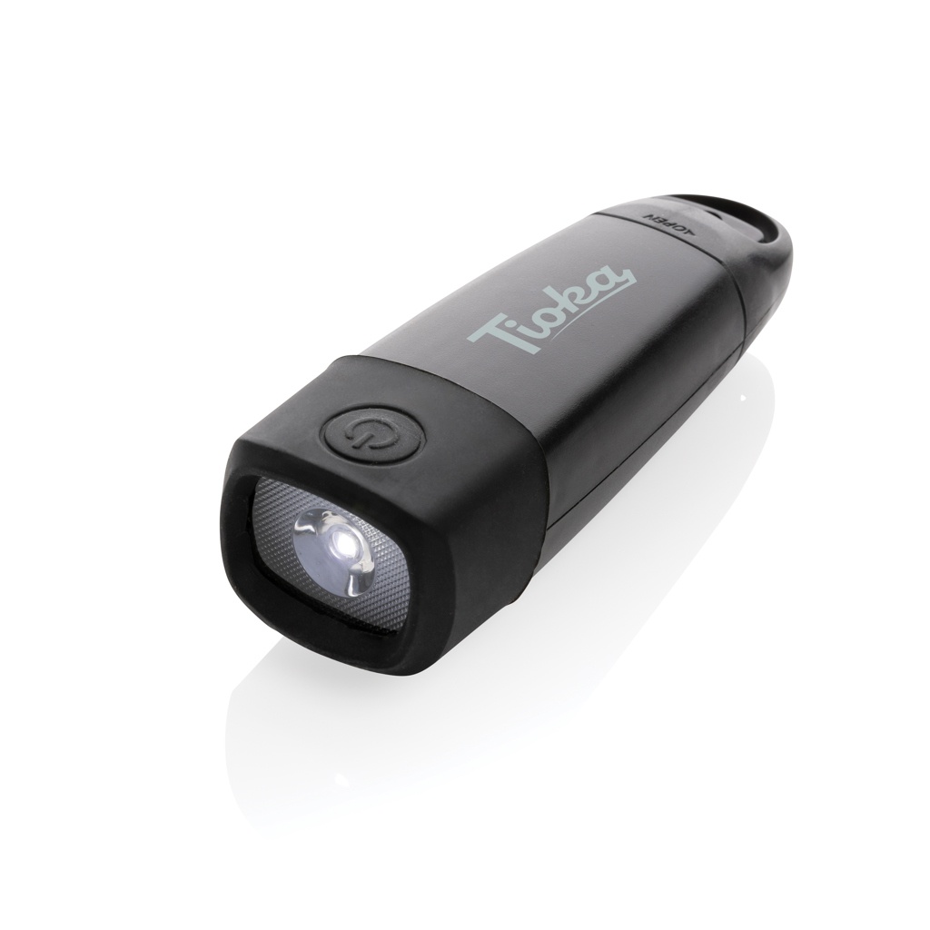 Extra bright torch with crank made with RCS certified recycled ABS plastic. Total recycled content: 30% based total item weight. RCS certification ensures a completely certified supply chain of the recycled materials. The torch uses a re-chargeable A-grade 620 mah lithium battery so no need to replace the batteries. Simply re-charge via your USB socket. 120 lumen LED light. With type C port for re-charging. Operating time on one charge: 2 hours. Crank can be used to add energy in case of emergency.