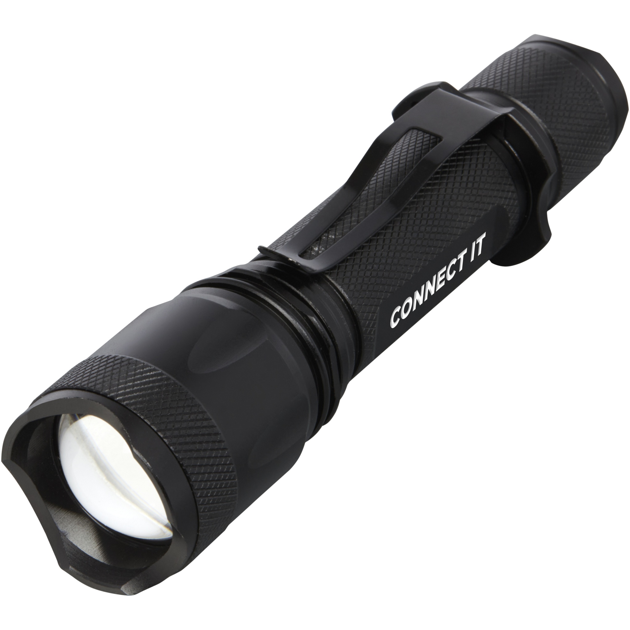 Never run out of battery with this rechargeable high power tactical aluminium flashlight. The solid black aluminium alloy casing offers a tactical look, with an impact resistance of 1 metre. The flashlight features a belt clip for easy carrying, and it is splash-proof with a IPX4 rating. The 5W LED generates 300 lumen for up to 3 hours, and has a beam distance of 200 meters with 5 different light modes: high, medium, low, strobe and SOS. The high power comes from a built-in lithium battery with a capacity of 2000mAh. The flashlight has a size of 14.5 x 3.4 cm and only weighs 170 gram. Comes with an instruction manual and is packed in a recycled cardboard gift box with a size of 17.5 x 6 x 4 cm. Laser engraving on the aluminium body is recommended.