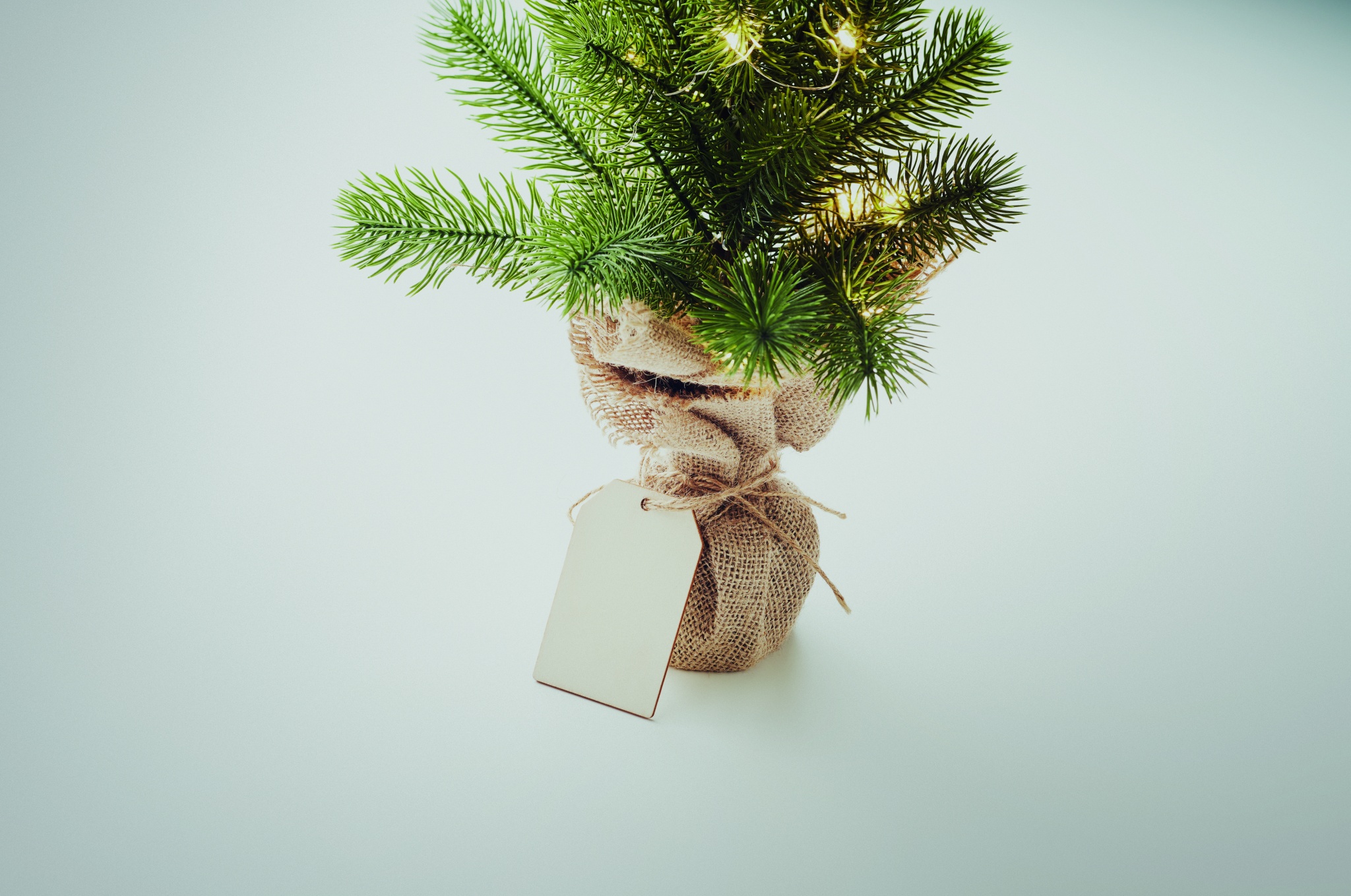 Mini artificial (PE) Christmas tree with 20 LED warm yellow string lights on a jute base. Comes with a wooden gift tag. 2 AA batteries excluded.