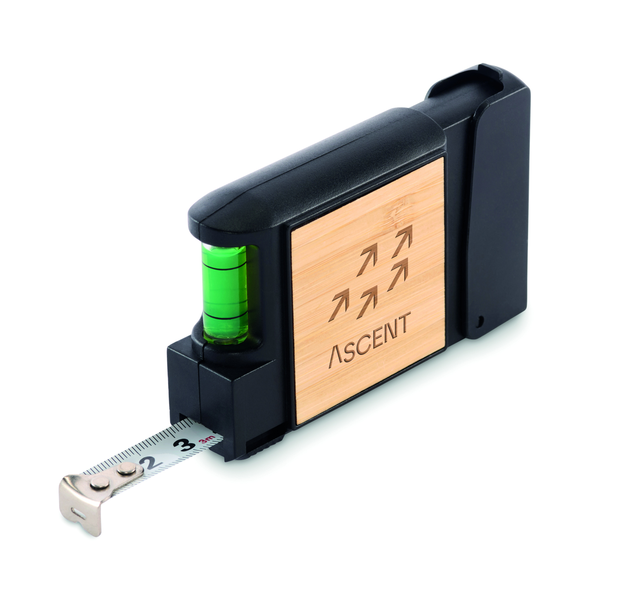 3M multifunctional measuring tape with bamboo detail, including spirit level and screwdrivers set with 5 bits.