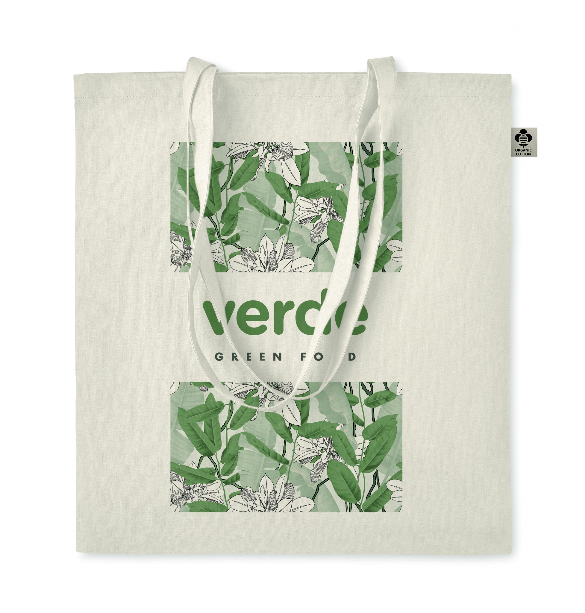 Organic cotton shopping bag with long handles. A classic tote bag design made to carry your daily groceries or other items. Carry the bag in your hands or over your shoulder with the long handles. Made from 100% natural organic cotton 140 gr/m².