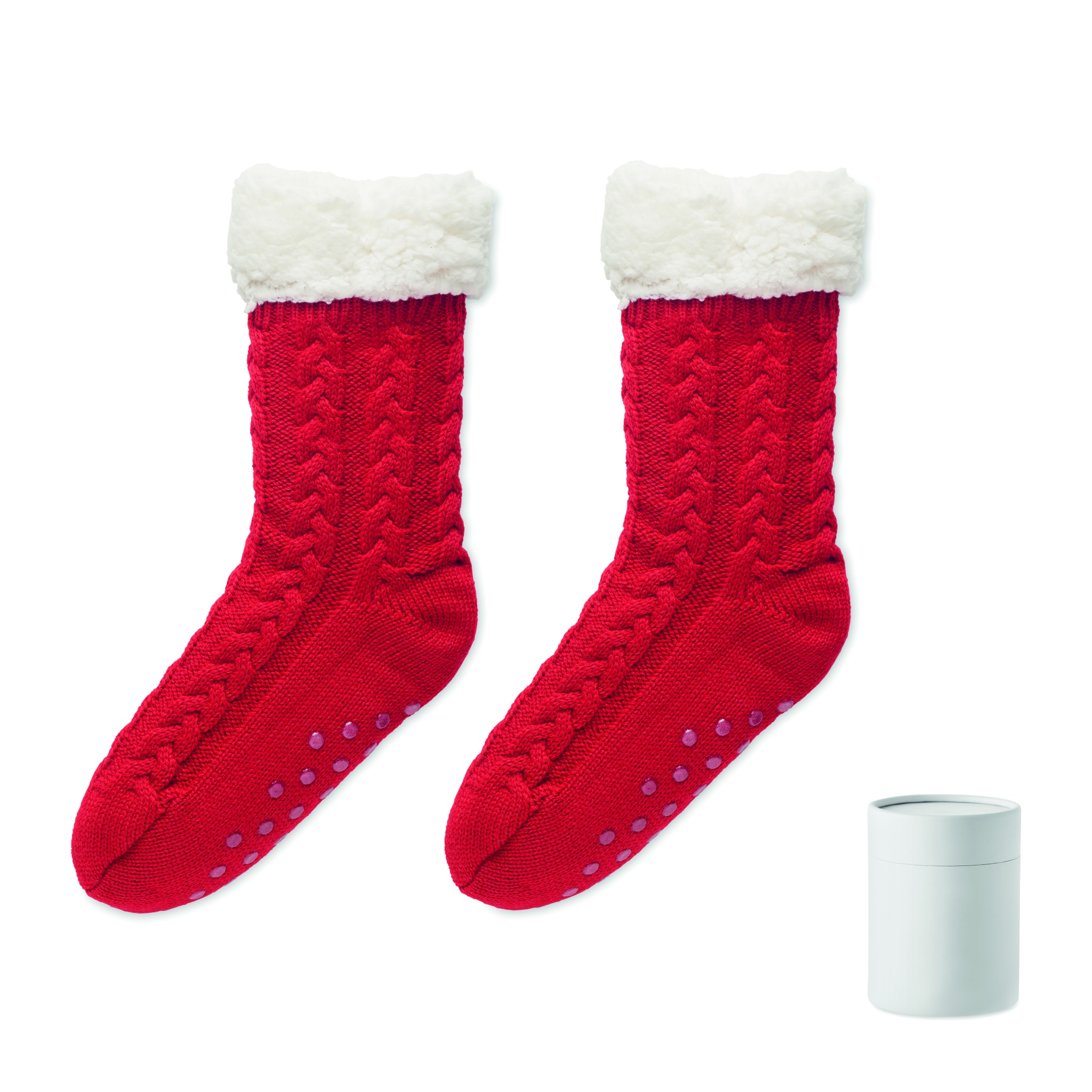 Pair of cable knit slipper socks with non-slip grippers on the bottom in Acrylic twine and 240 gr/m² faux sherpa lining. Presented in giftbox. Size L= 40-43.