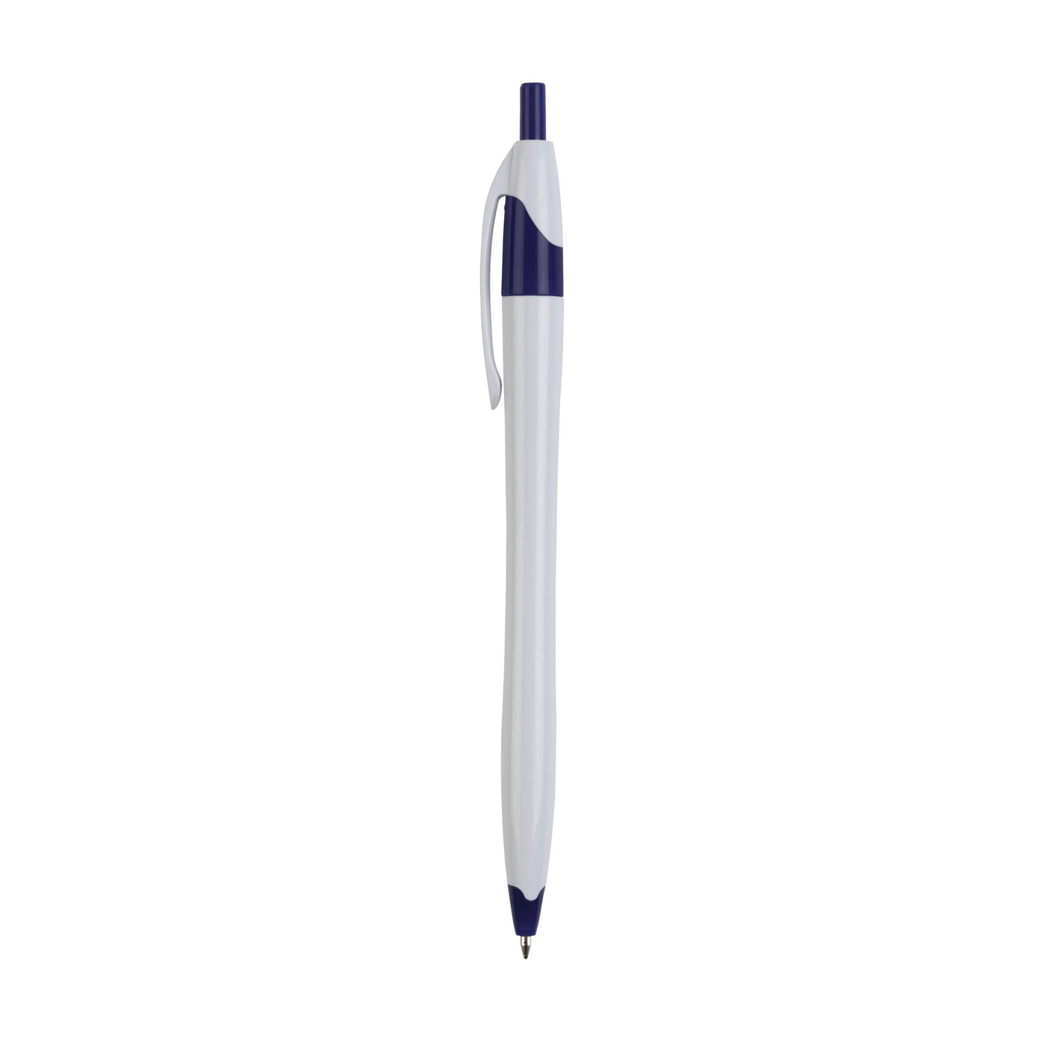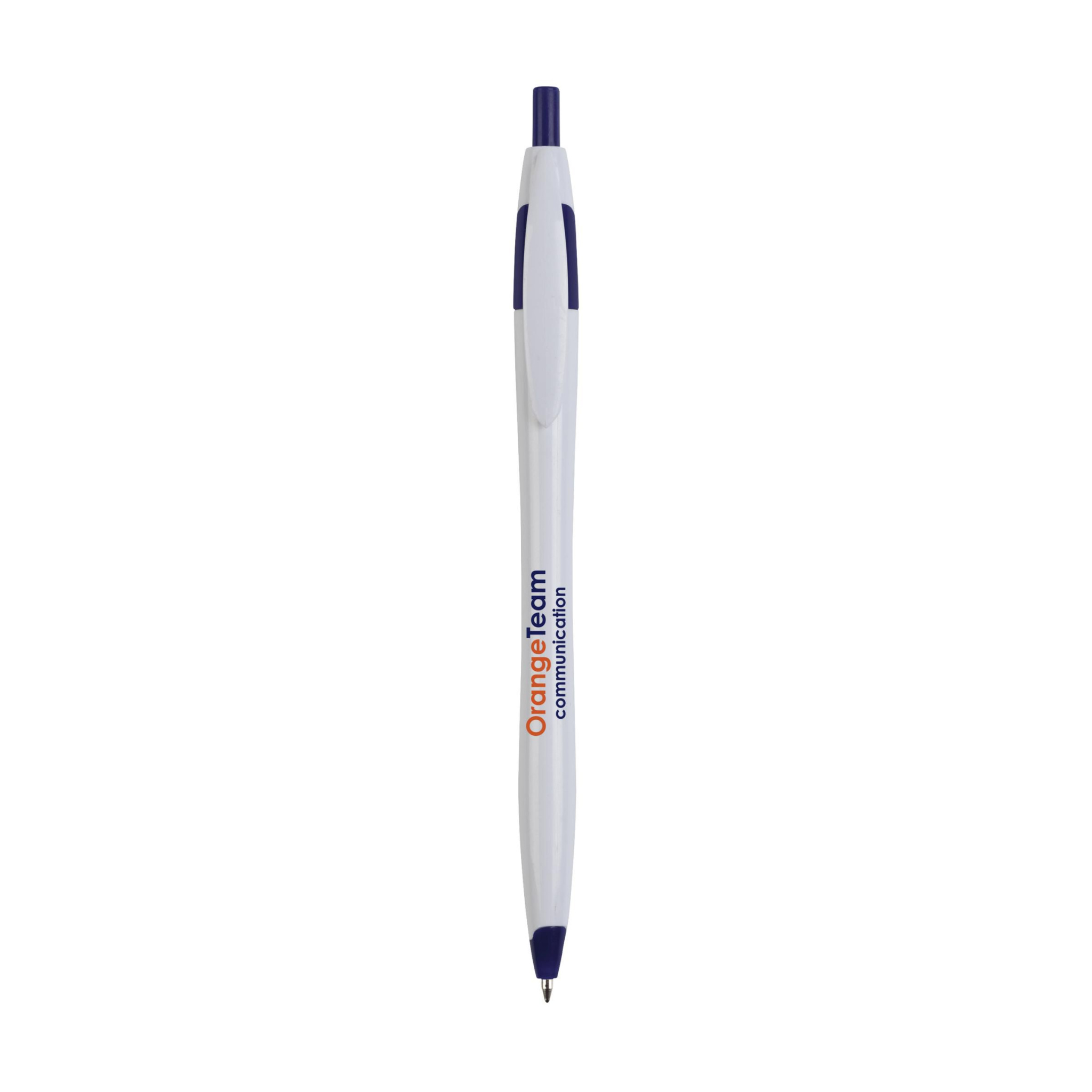 Blue ink ballpoint pen with coloured accents and streamlined barrel.