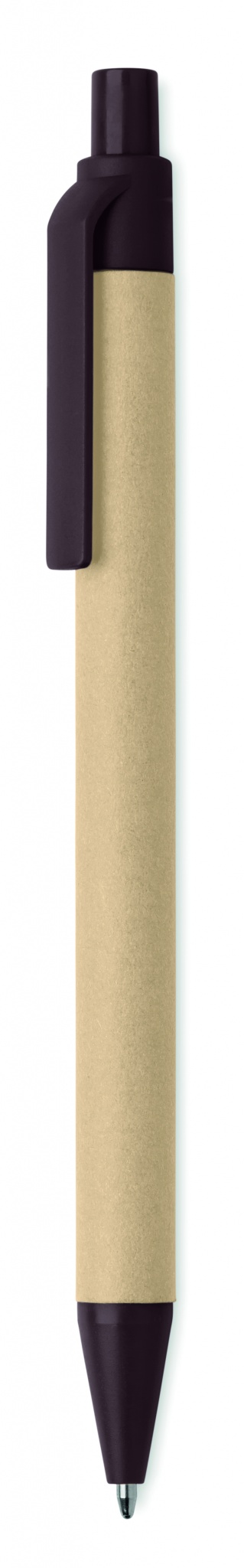Push button paper barrel ball pen with parts made of 40% coffee husk and 60% ABS. Blue ink.