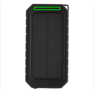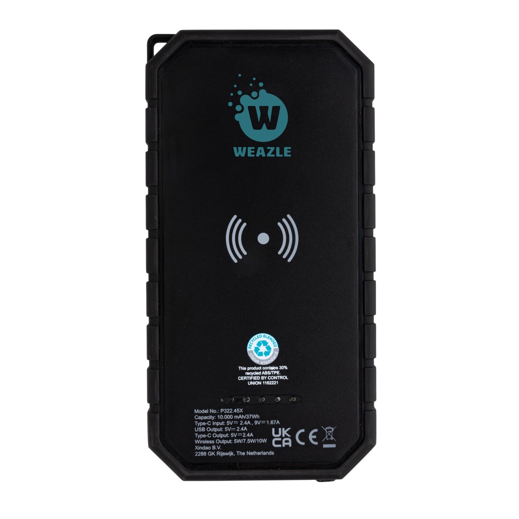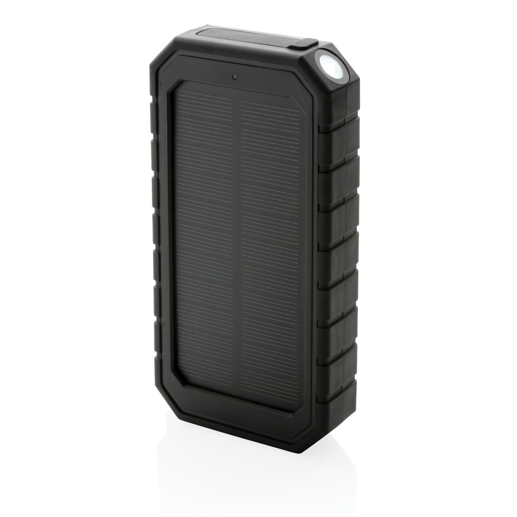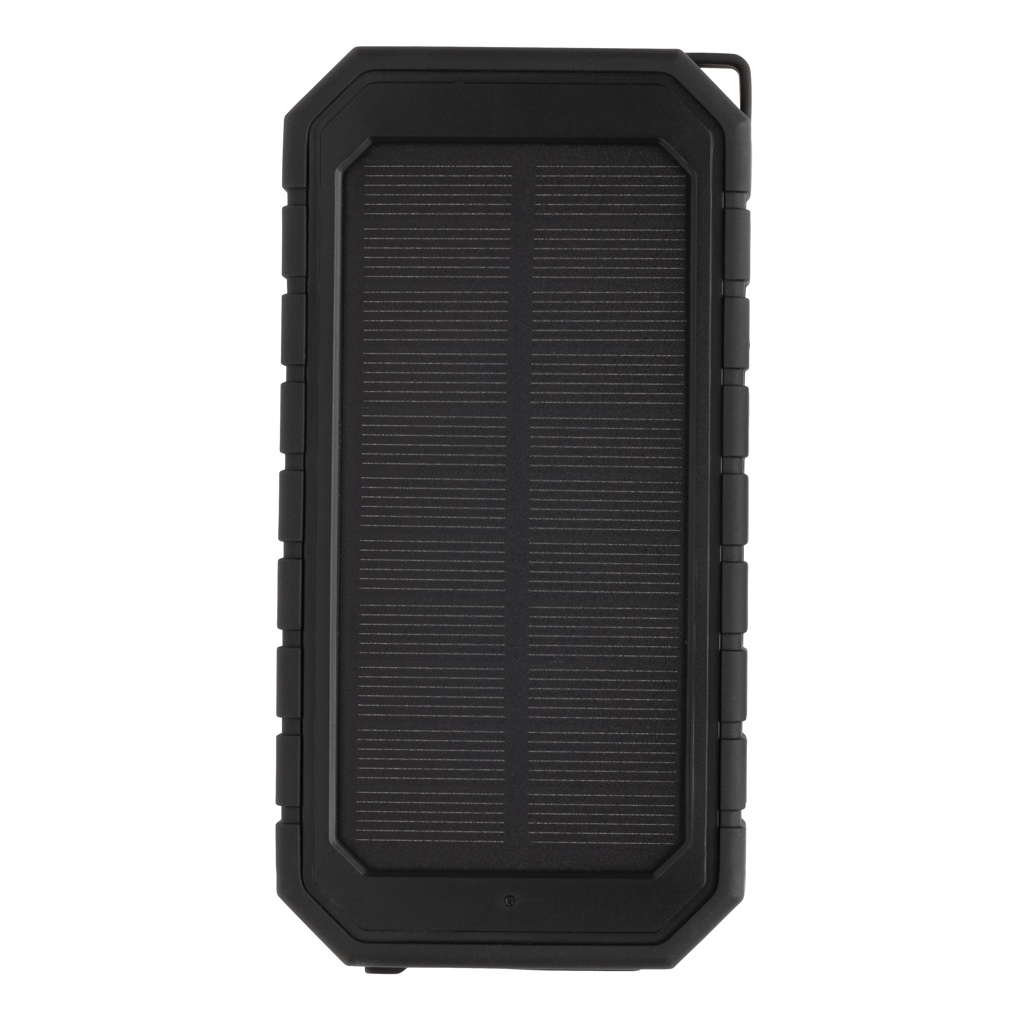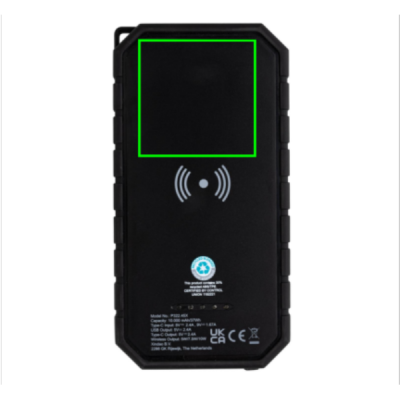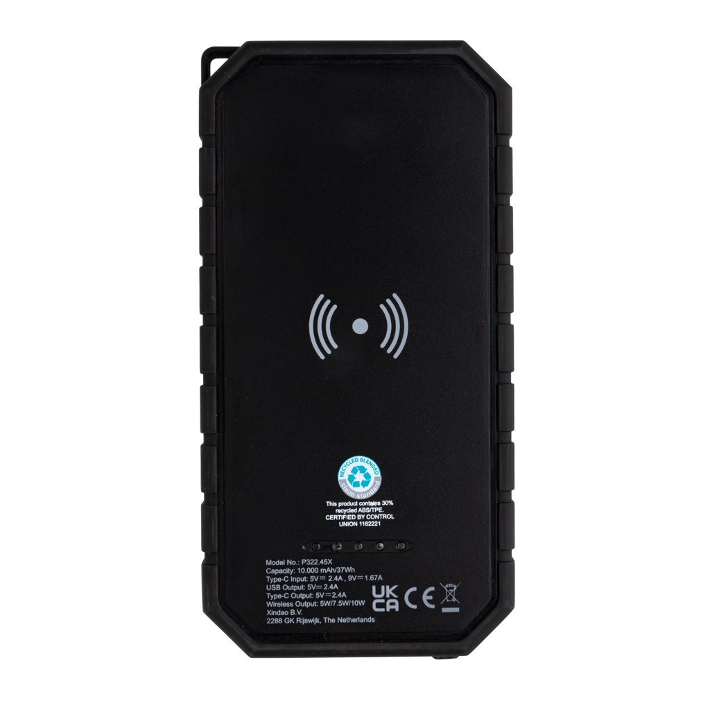 Fast 10.000 mah 10W wireless charging solar powerbank made with RCS (Recycled Claim Standard) certified recycled ABS and TPE. Total recycled content: 30% based on total item weight. RCS certification ensures a completely certified supply chain of the recycled materials. The powerbank supports both charging via cable (type C and USB) as via the 10W wireless fast charger. Wireless charging compatible with all QI enabled devices like Android latest generation, iPhone 8 and up. It has a solar panel along with a flashlight and a carabiner clip to attach to any bag. IPX5 Waterproof. With remaining battery indicator. Including type C charging cable made from GRS certified recycled TPE. Packed in FSC® mix kraft box. USB Output: 5V/2.4A; Type C Output: 5V/2.4A .Item and accessories 100% PVC free
