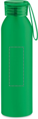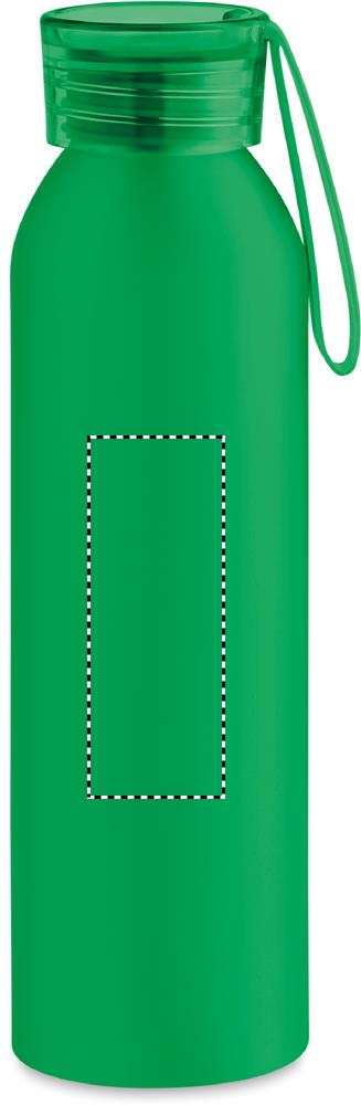 Single wall in recycled aluminium bottle with PS lid and silicone hanger. Capacity: 600 ml. Leak free.